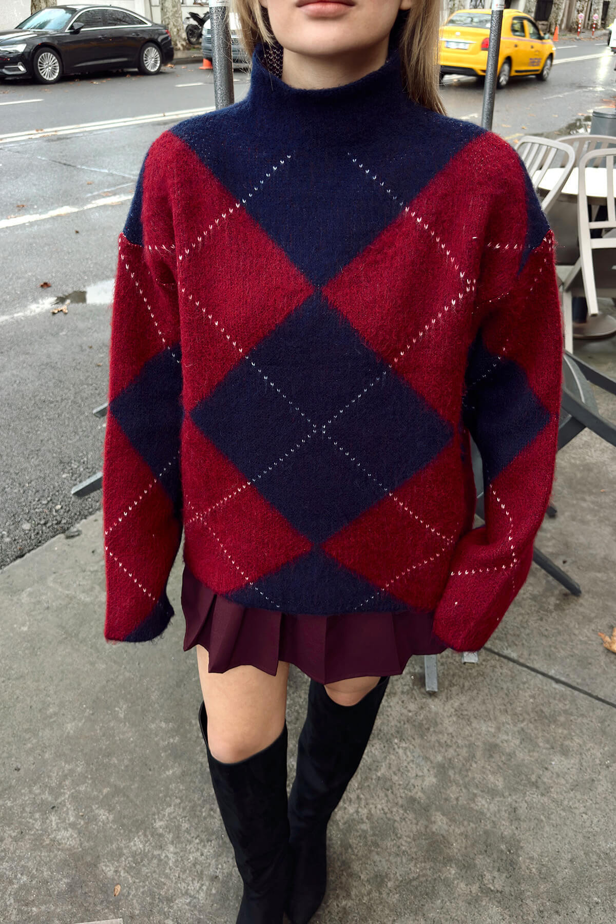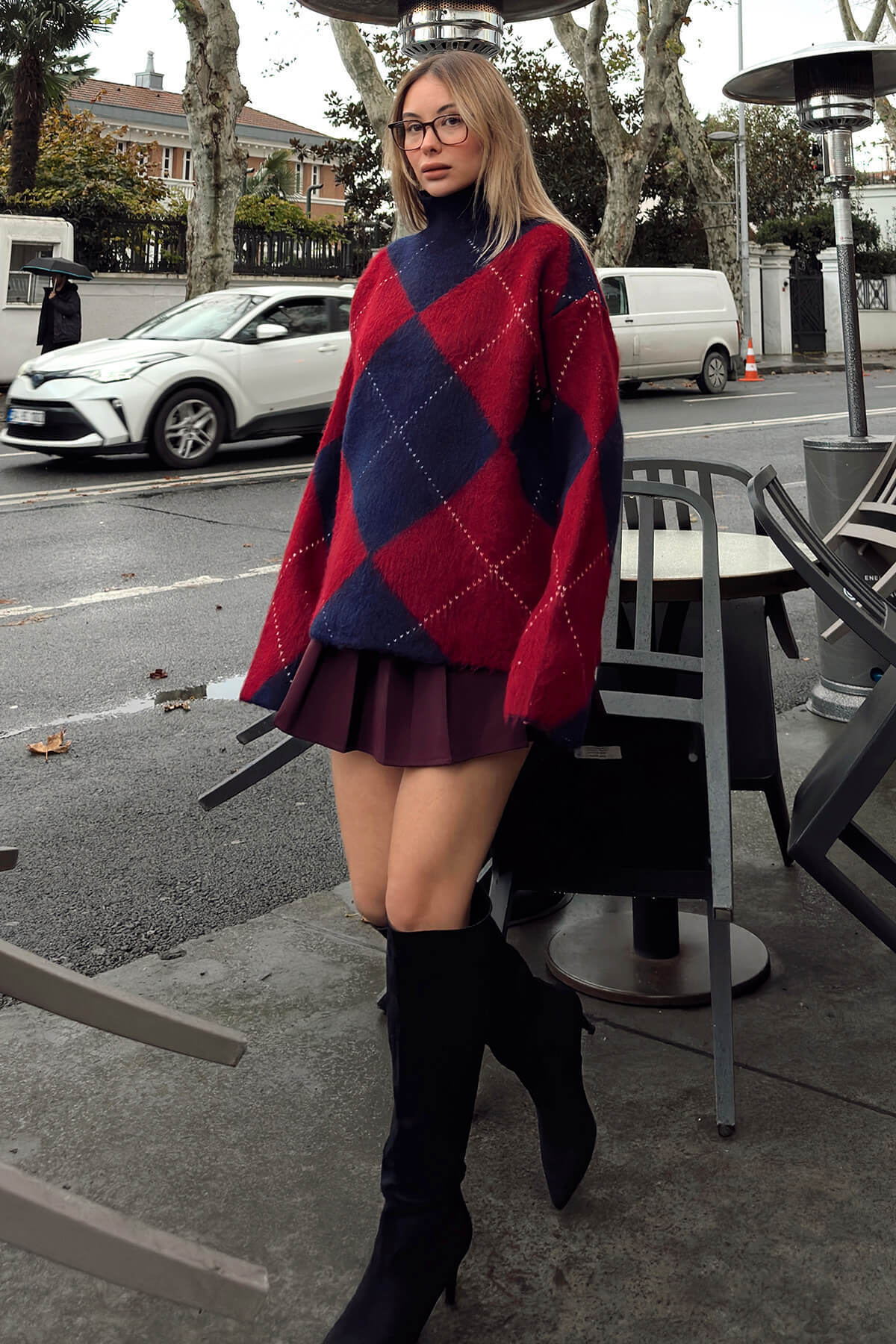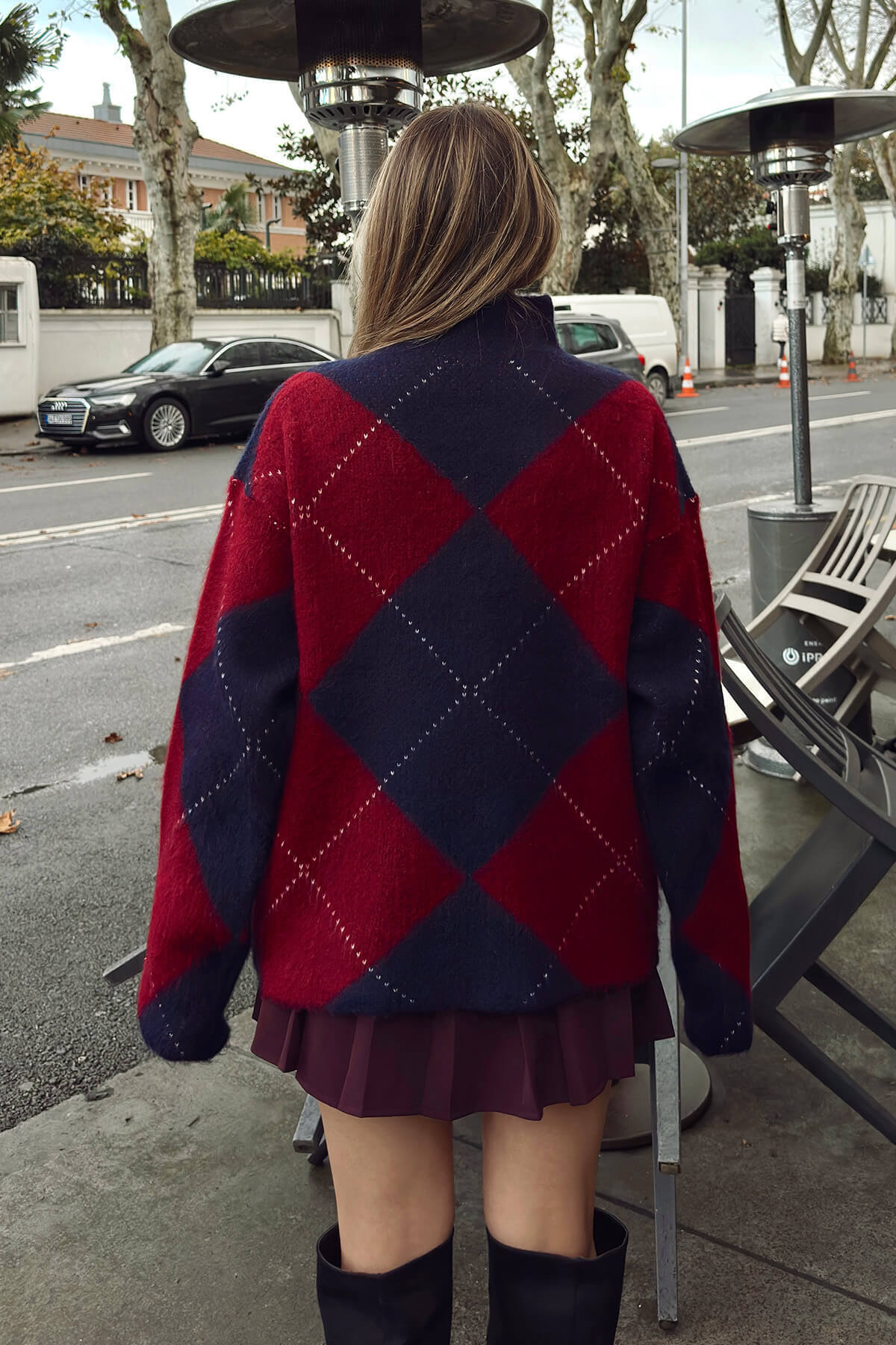 Bordo Dik Yaka Bakalava Desen Kadın Triko Kazak