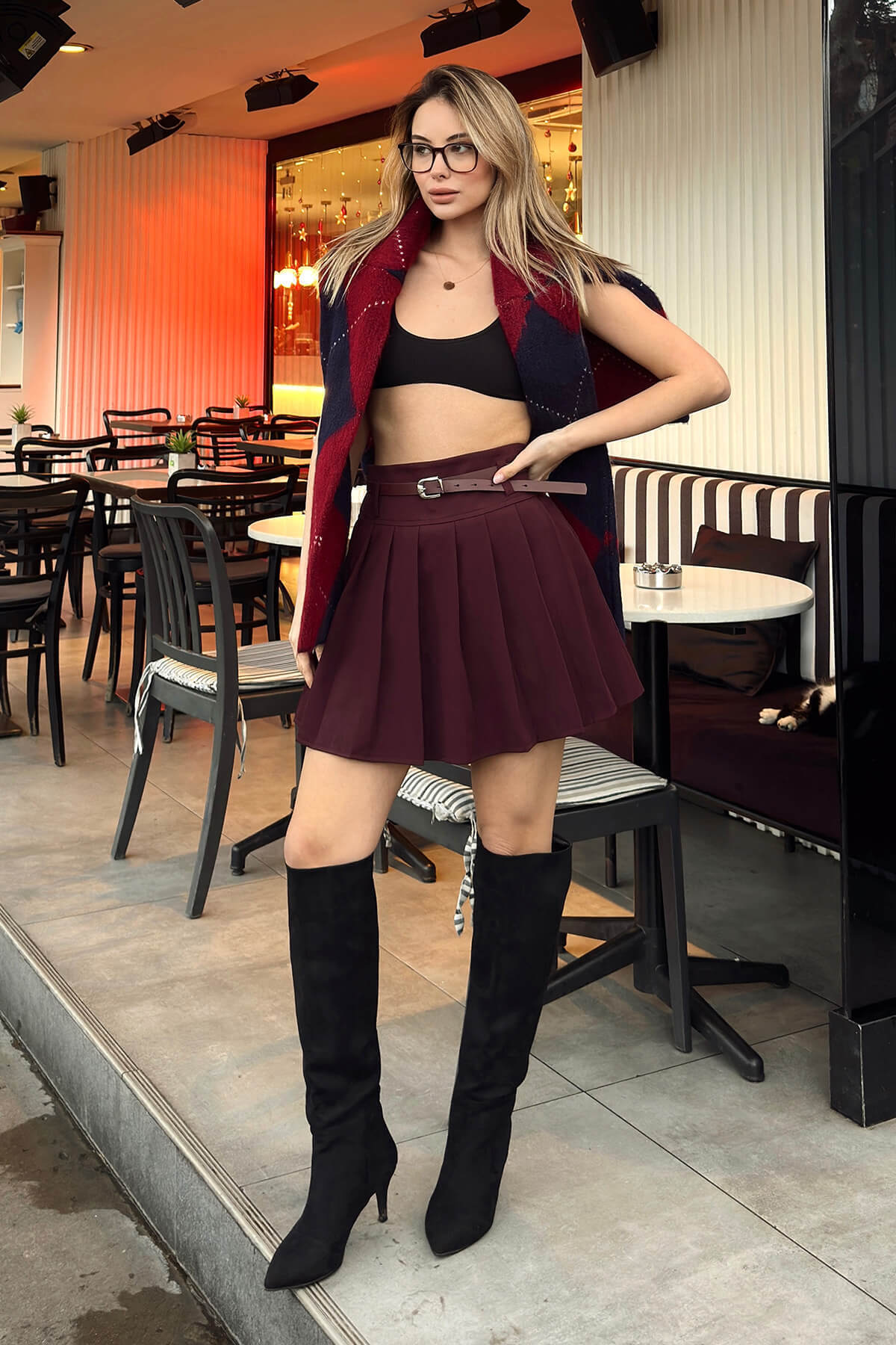 Bordo Full Pileli Kemerli Astar Şortlu Kadın Mini Etek