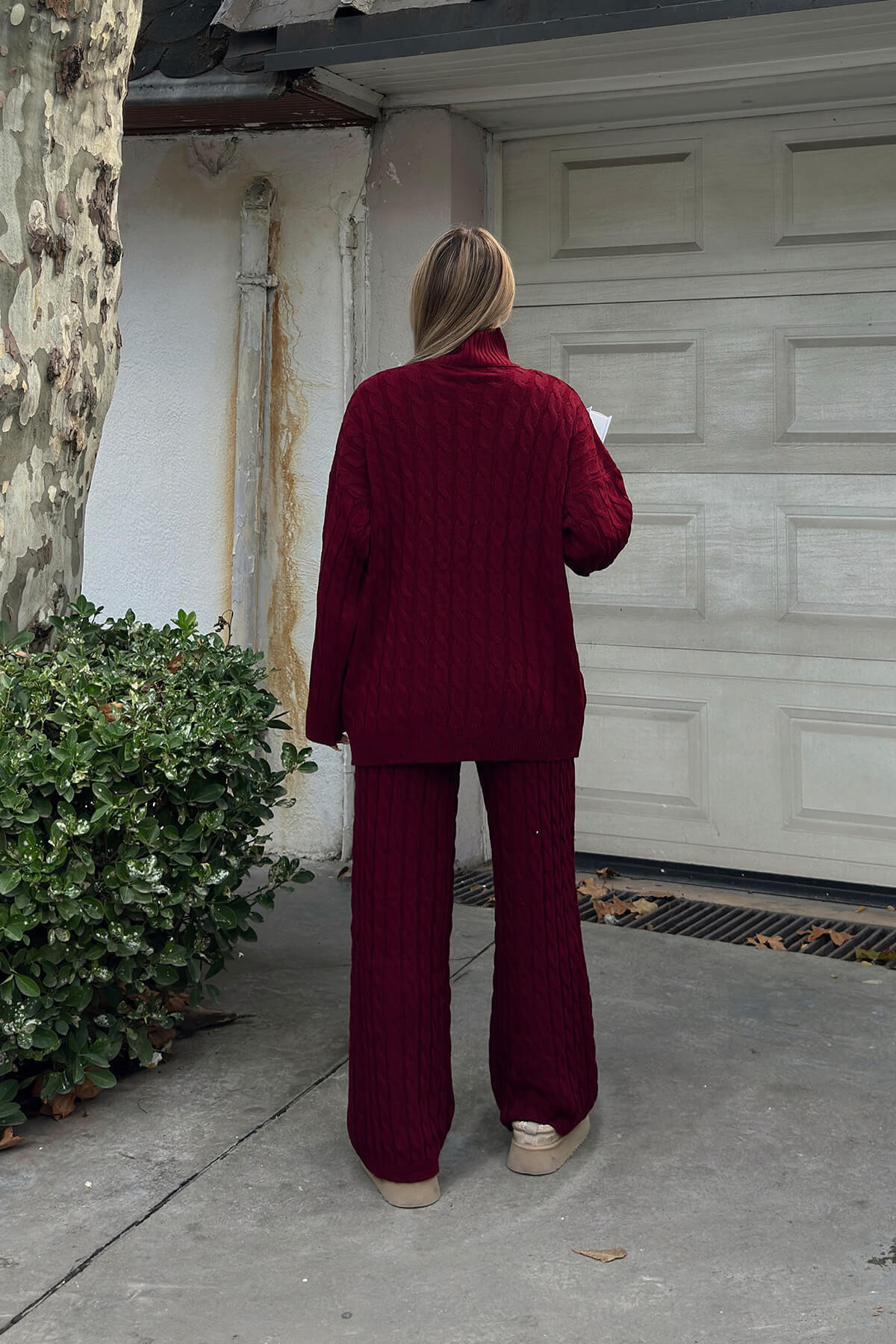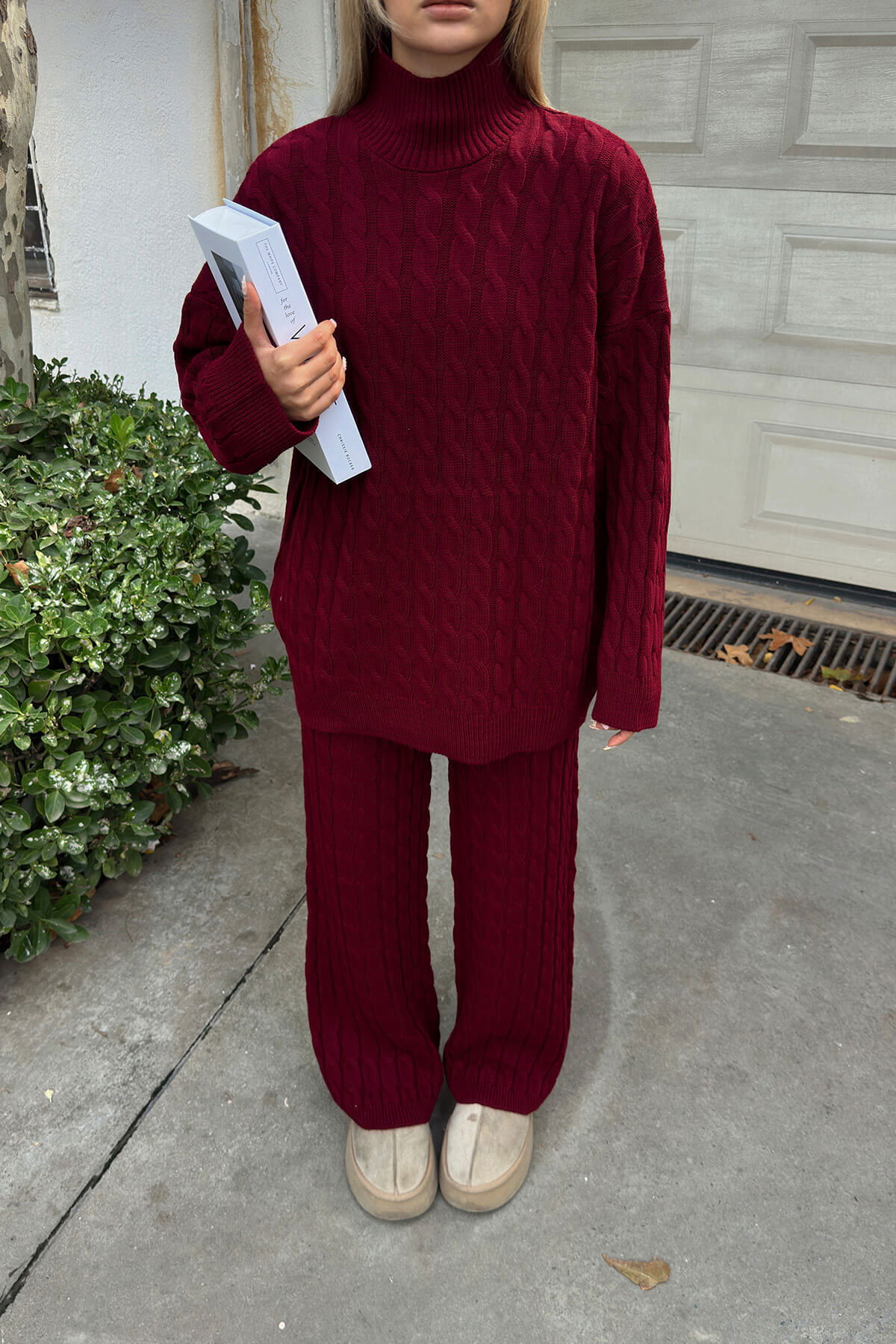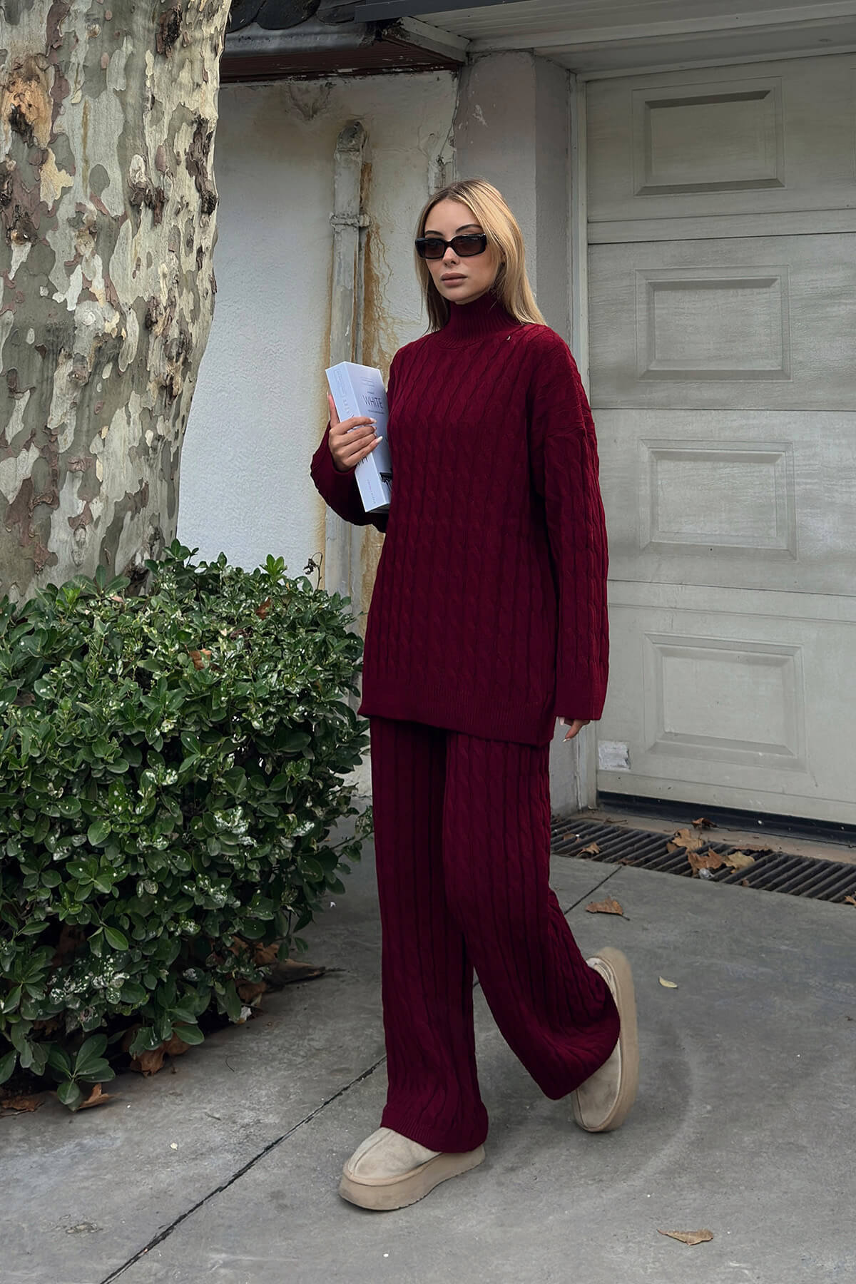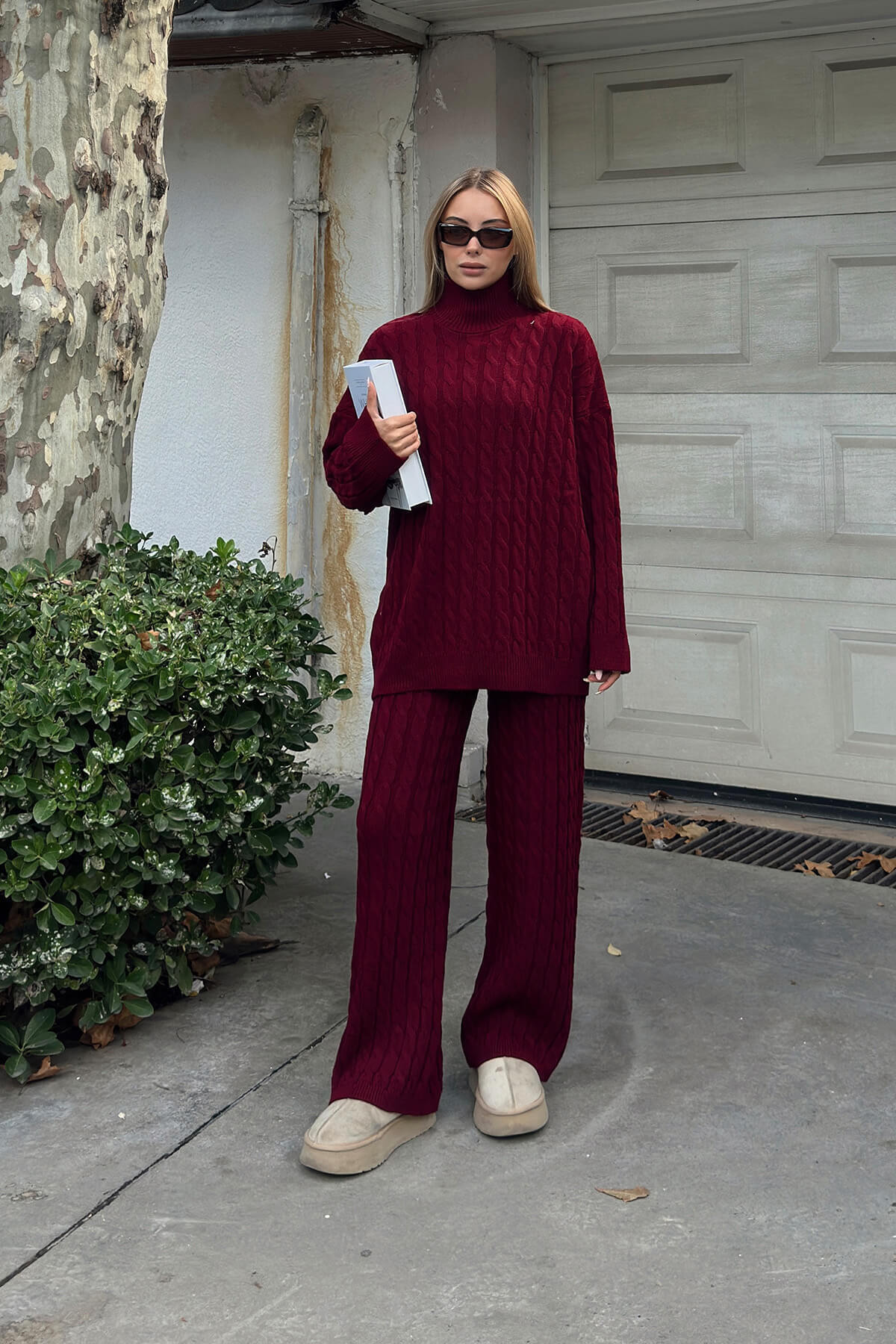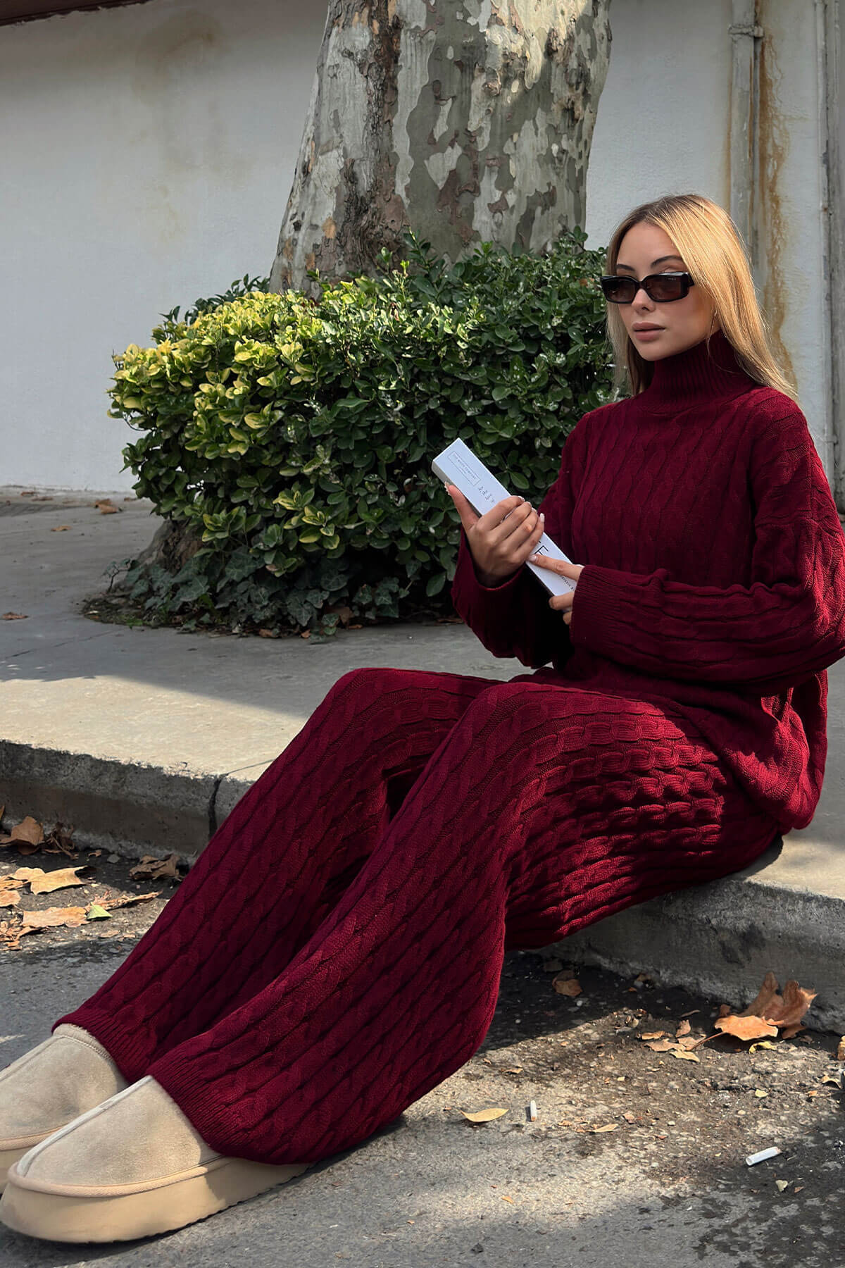 Bordo Tail Saç Örgü Desenli Kazak-Pantolon Kadın Alt Üst Takım
