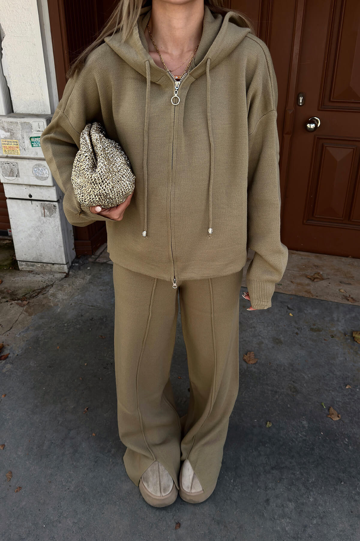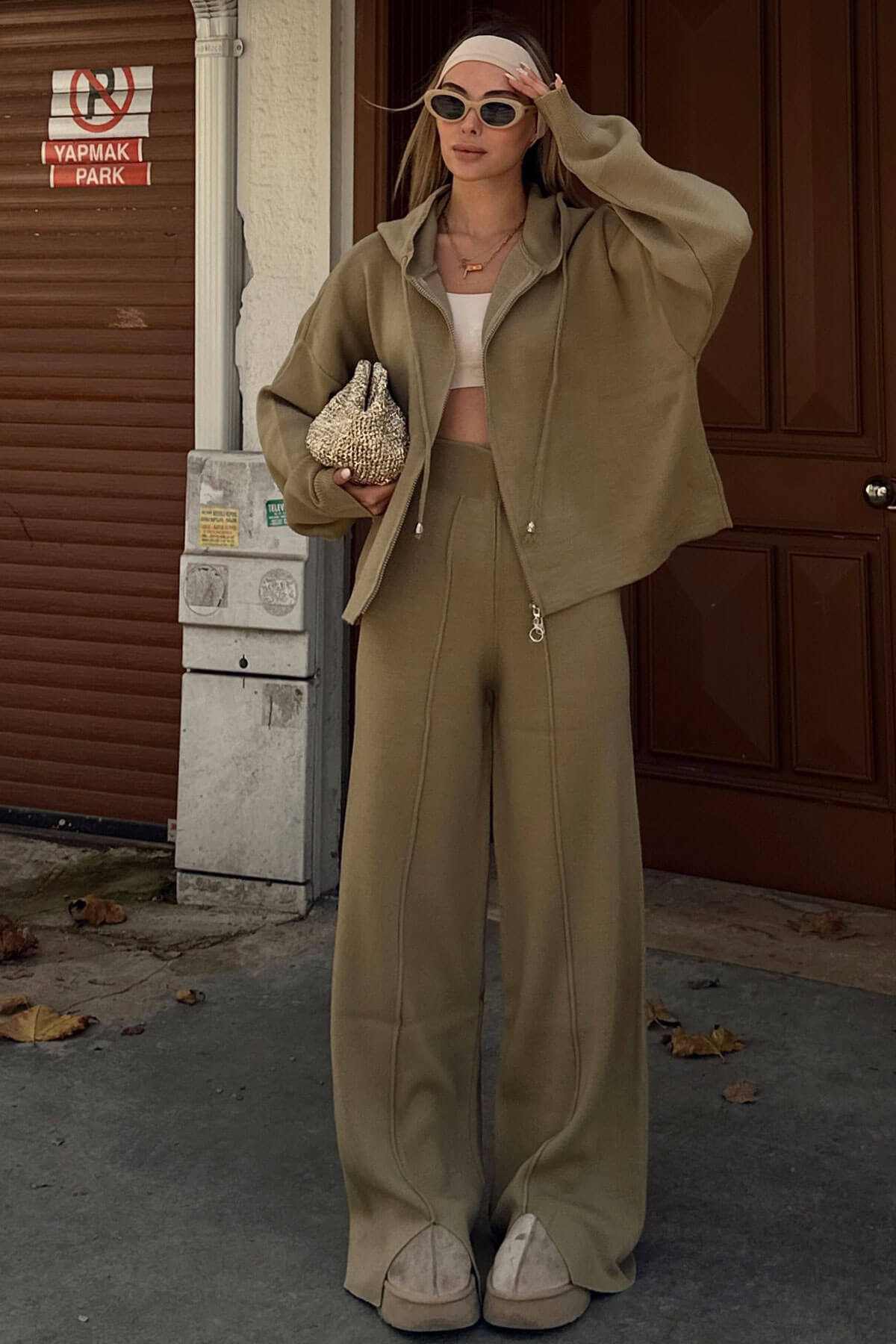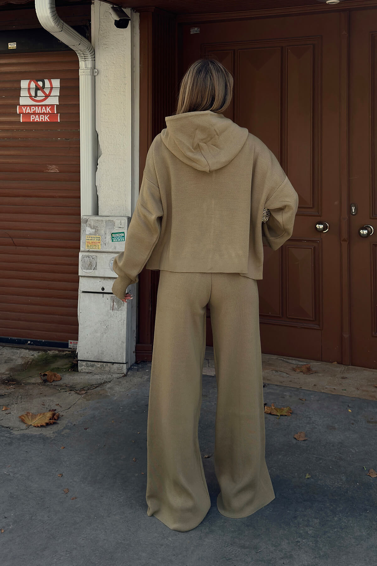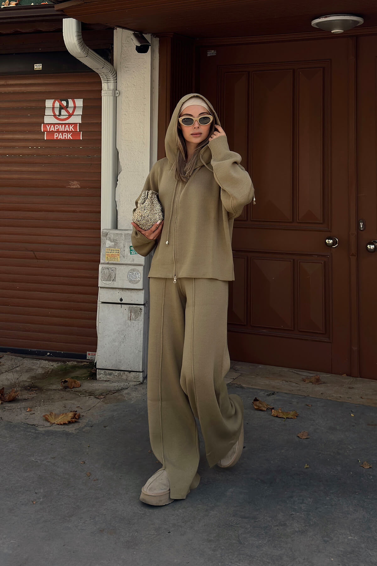 Çimalı kapüşonlu hırka ve uyumlu triko pantolondan oluşan oversize kadın alt-üst takımımız, şehirli ve rahat bir şıklık sunar. Çimalı (kabartmalı) örgü dokusu modele dokusal bir zenginlik katar ve el yapımı hissi uyandırır. Kapüşonlu hırkanın geniş kesimi katmanlama için idealdir; gündüzden geceye rahatlıkla geçiş yapar. Pantolonun elastik bel bandı ve düz paça kesimi rahat kullanım sağlar; oversize duruşla bütünleşen modern bir siluet oluşturur. Çima detayları fonksiyonellik kazandırırken, sağlam dikişler uzun ömür sağlar. Kalın triko örümü soğuk havalarda ekstra sıcaklık sunar; yumuşak iç yüzeyi konforu artırır. Ribana manşet ve etek ucu modelin formunu korur; çimalı desen küçük farklılıklarla özgünlük katar. Farklı renk alternatifleriyle sunulan takım, spor ayakkabıdan botlara kadar çeşitli ayakkabılarla uyum sağlar. Kolay bakım talimatları ve dayanıklı malzeme seçimi sayesinde bu oversize takım, gardırobunuzun favori rahat parçası olacaktır. Tavsiye ederiz kesinlikle Şıklığı ve rahatlığı bir arada.