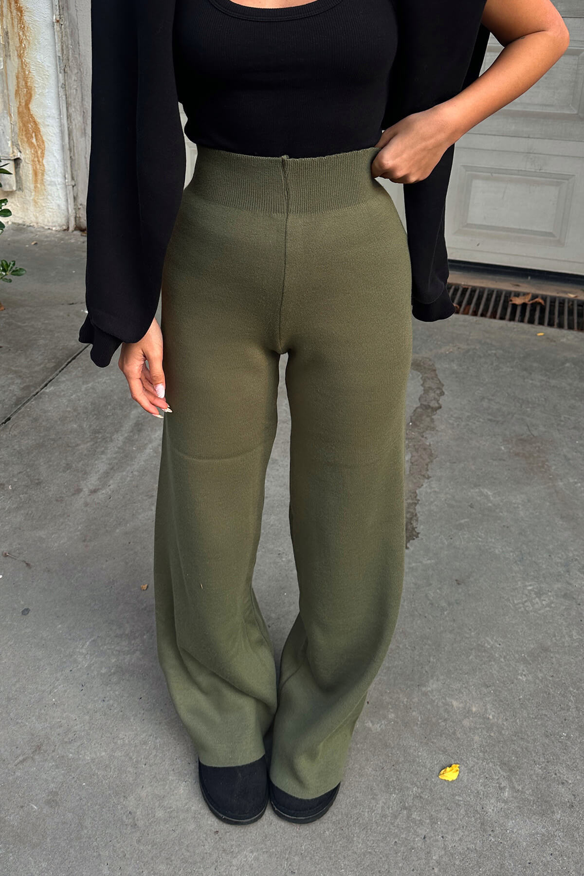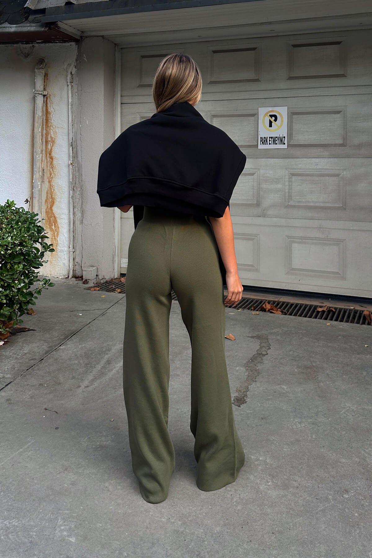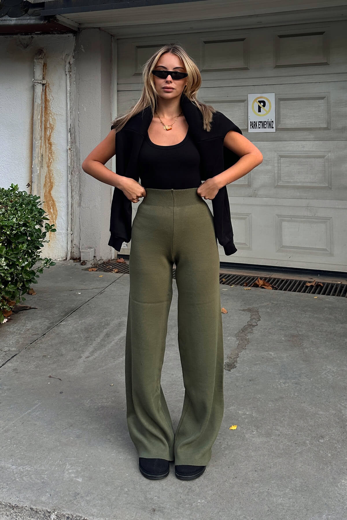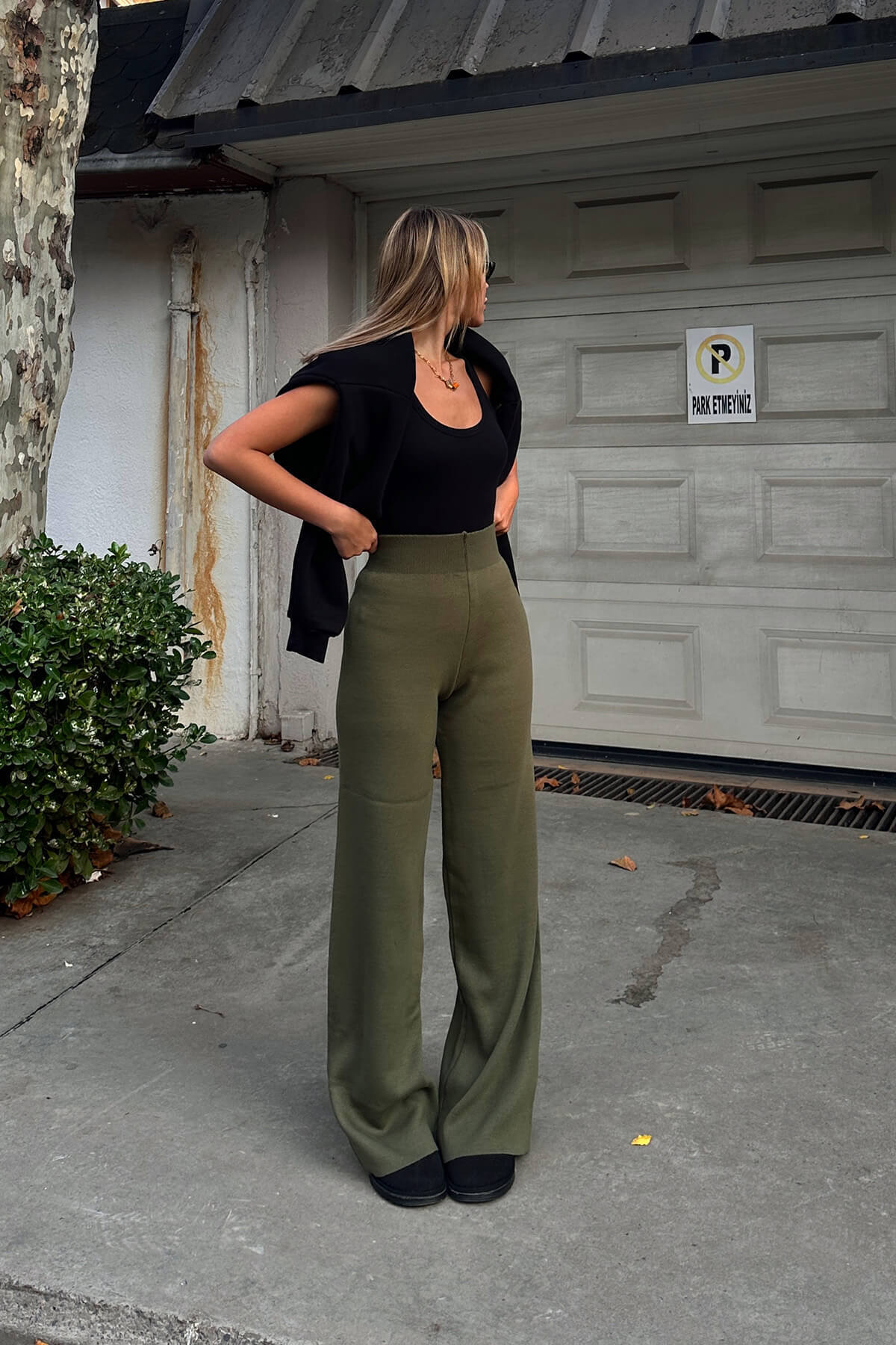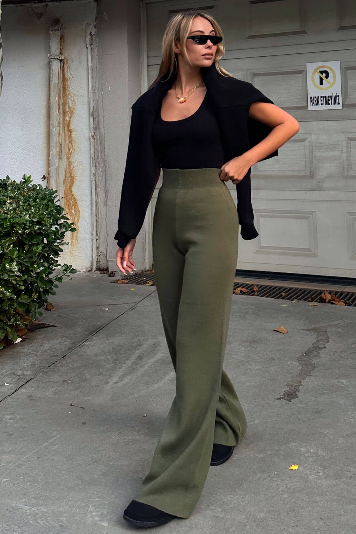 Haki Yüksek Bel Beli Lastikli Kadın Triko Pantolon