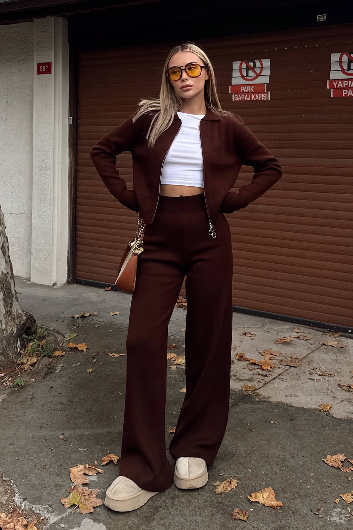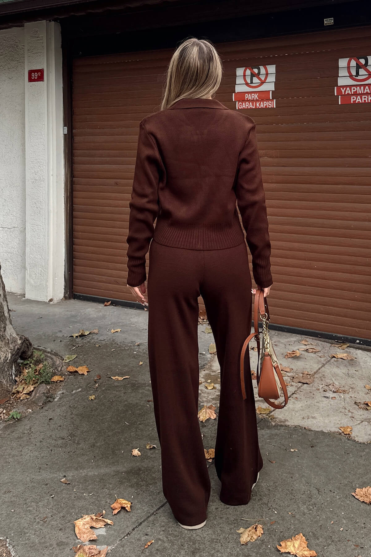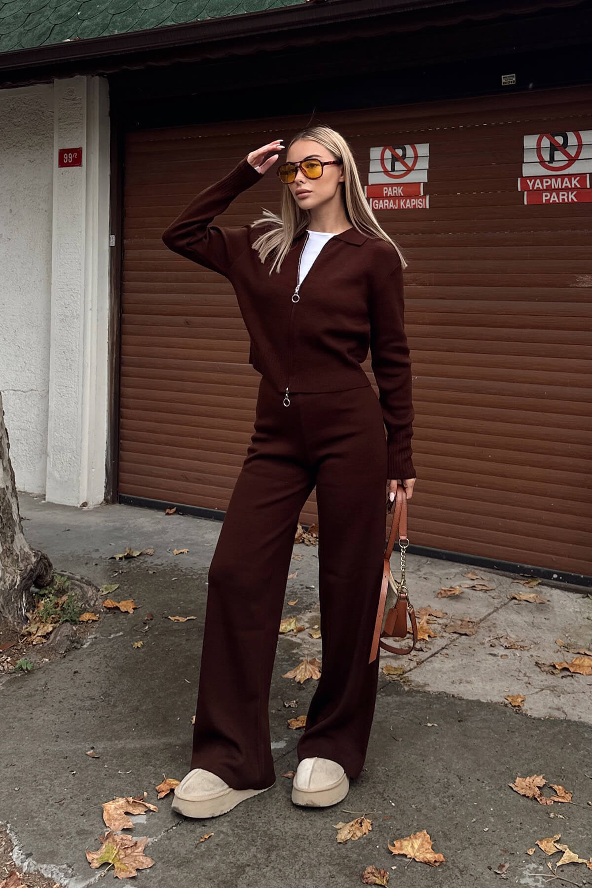 Kahverengi Cara Polo Yaka Çift Yönlü Fermuarlı Crop-Pantolon Kadın Triko Alt Üst Takım - 1