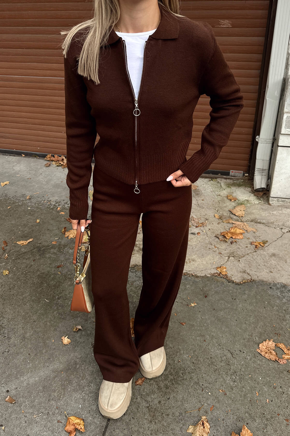 Kahverengi Cara Polo Yaka Çift Yönlü Fermuarlı Crop-Pantolon Kadın Triko Alt Üst Takım