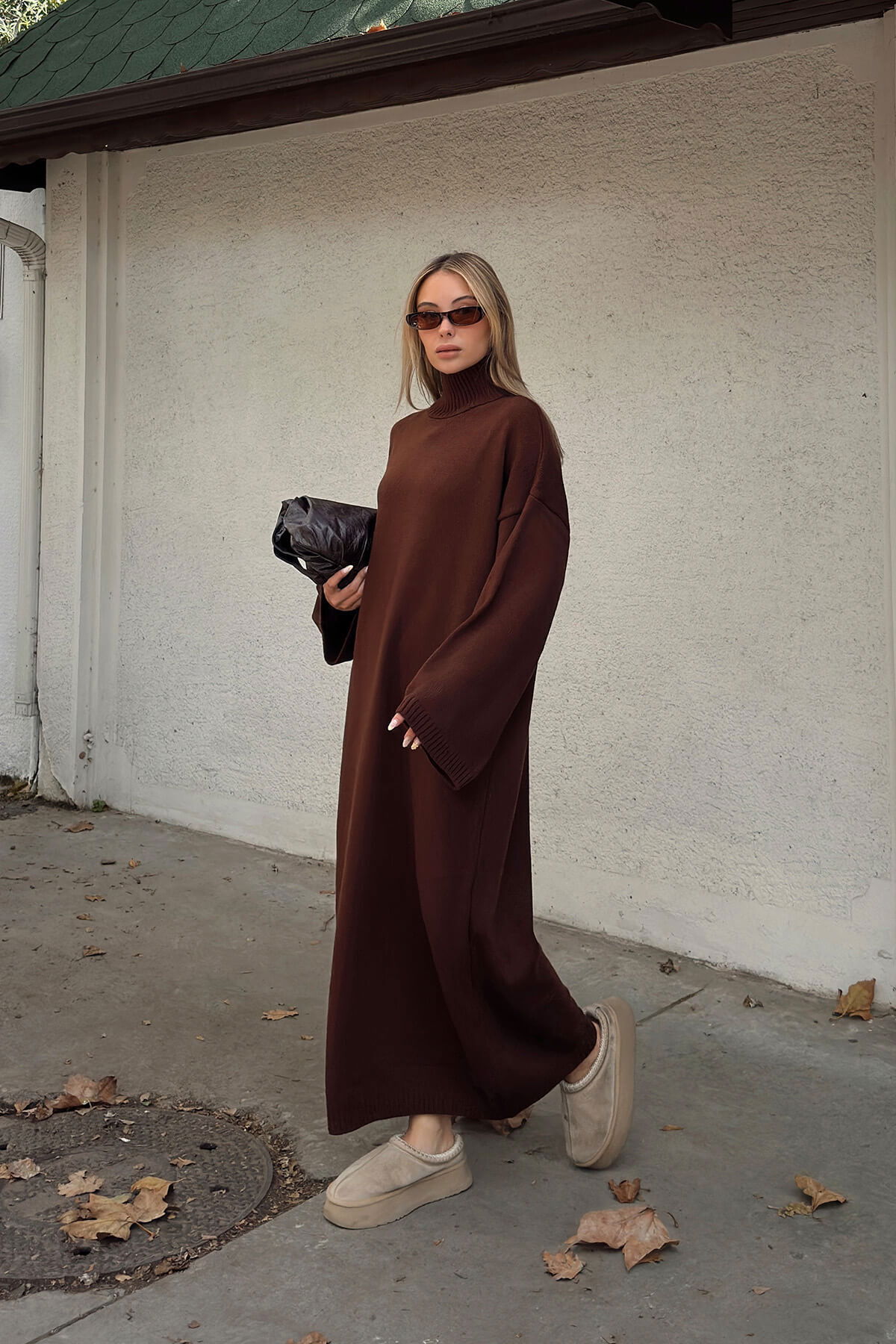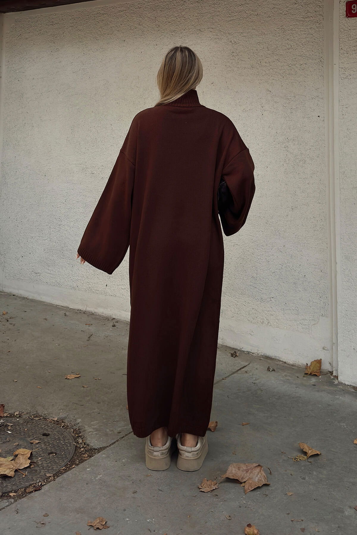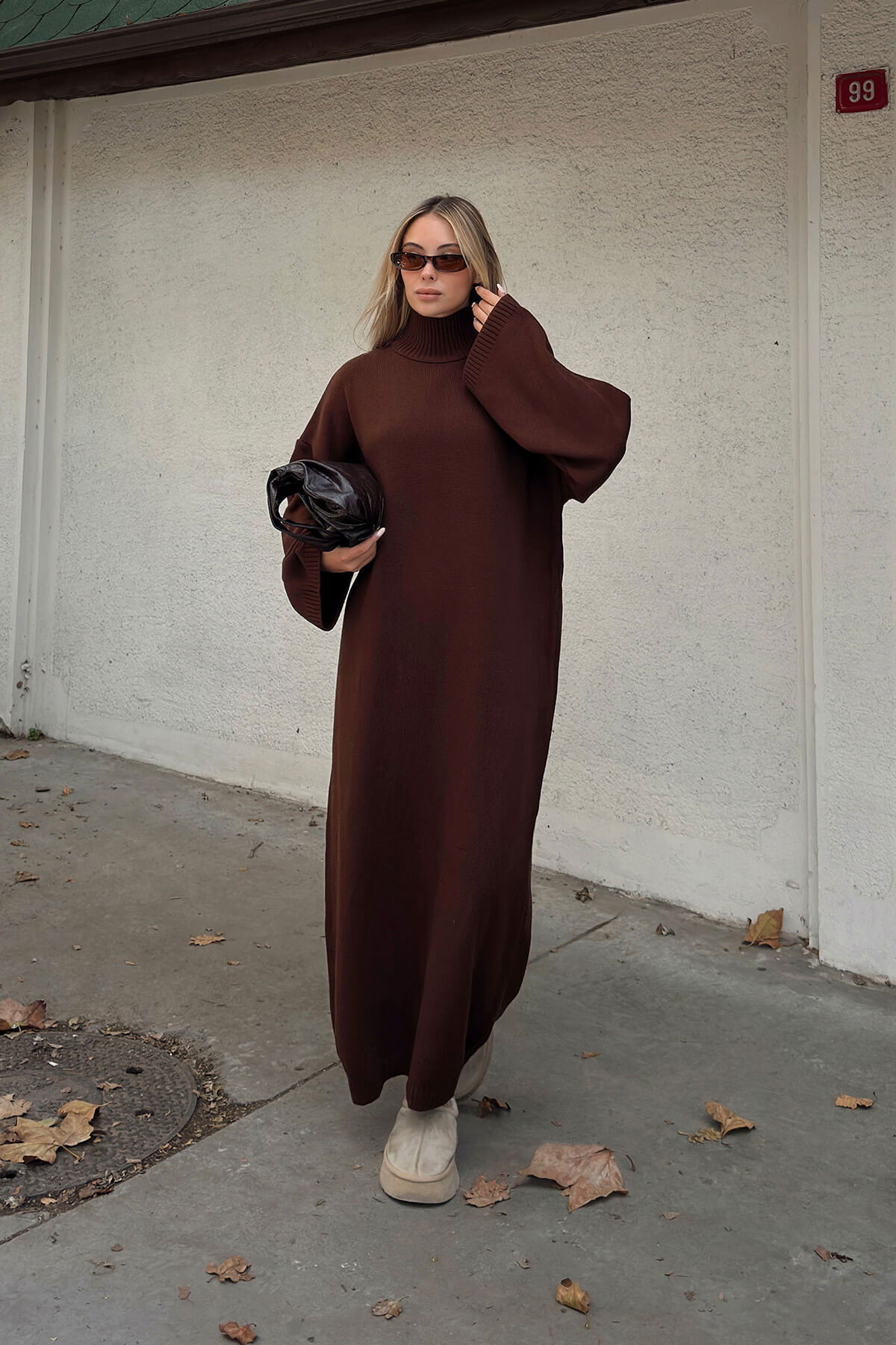 Kahverengi Daly Yarım Balıkçı Oversize Kadın Triko Midi Elbise