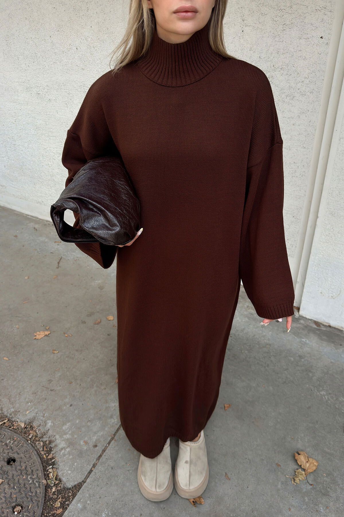 Kahverengi Daly Yarım Balıkçı Oversize Kadın Triko Midi Elbise - 1