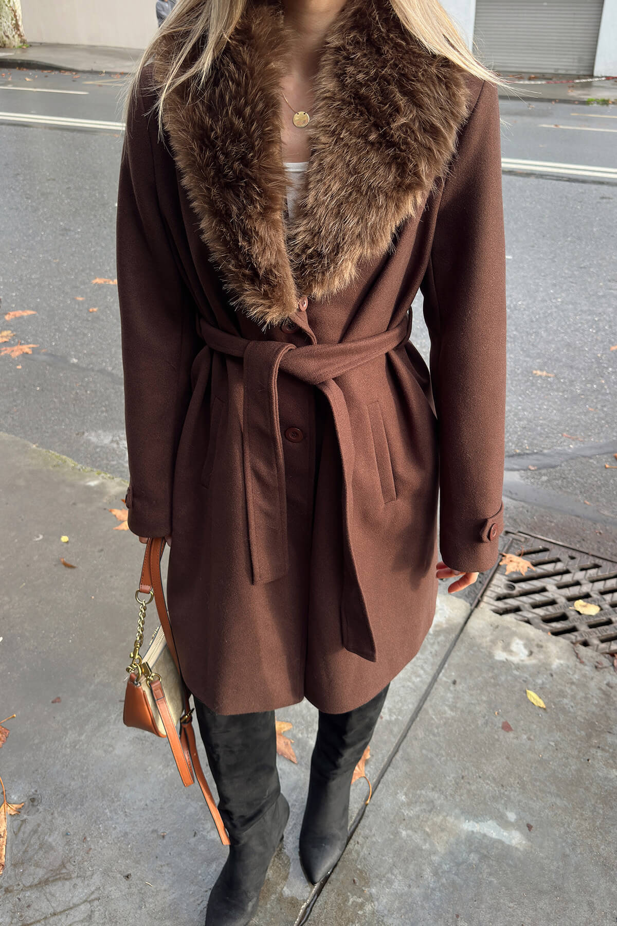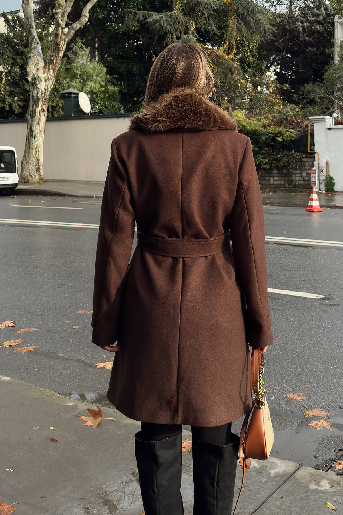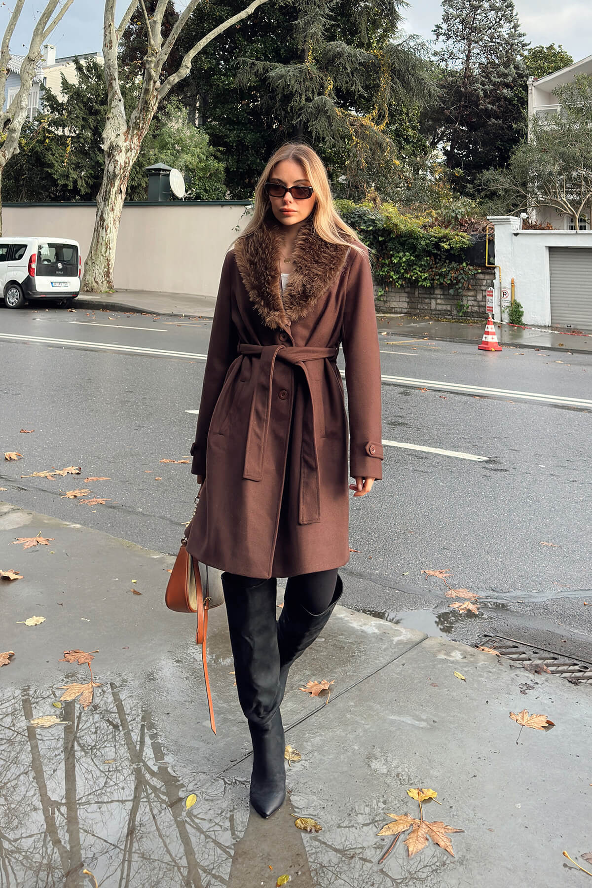 Yaka Kürklü Kol Manşet Detay Kuşaklı Kadın Kaşe Kaban, kış aylarında şıklık ve fonksiyonelliği bir arada sunan özel bir dış giyim parçasıdır. Yaka kısmında yer alan kürk detayı, kabanın lüks ve sofistike bir görünüm kazanmasını sağlarken soğuk havalara karşı ekstra koruma sunar. Kol manşetlerindeki kürk dokunuşu, tasarıma bütünlük katarak zarif ve dikkat çekici bir stil oluşturur. Kuşaklı formu sayesinde bel hattını vurgulayan bu kaşe kaban, feminen ve dengeli bir siluet yaratır. Kaşe kumaşın tok ve sıcak tutan yapısı, kış mevsiminde konforlu bir kullanım sağlarken aynı zamanda uzun ömürlü bir duruş sunar. Günlük şehir kombinlerinden ofis stiline ve özel davetlere kadar geniş bir kullanım alanına sahip olan bu kadın kaşe kaban; elbiseler, etekler ve pantolonlarla kolayca kombinlenerek zamansız bir kış şıklığı sunar.