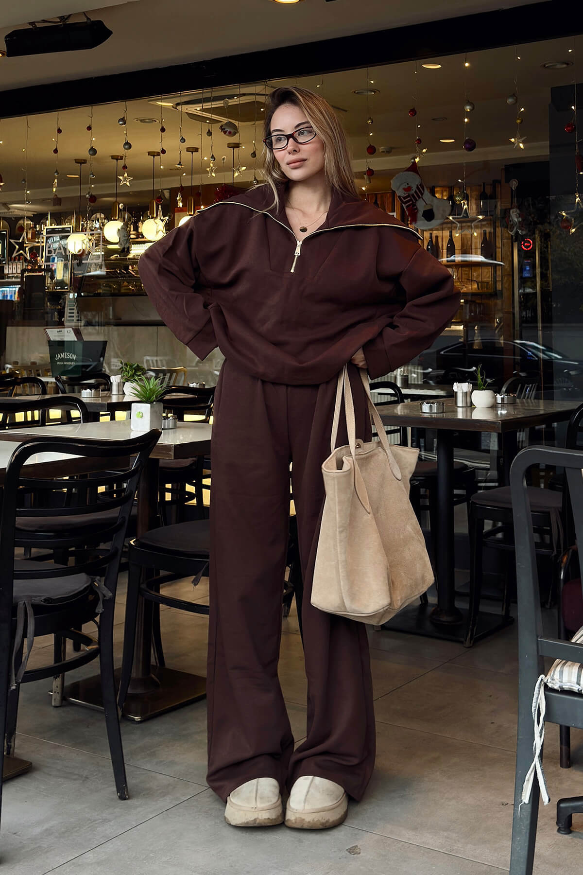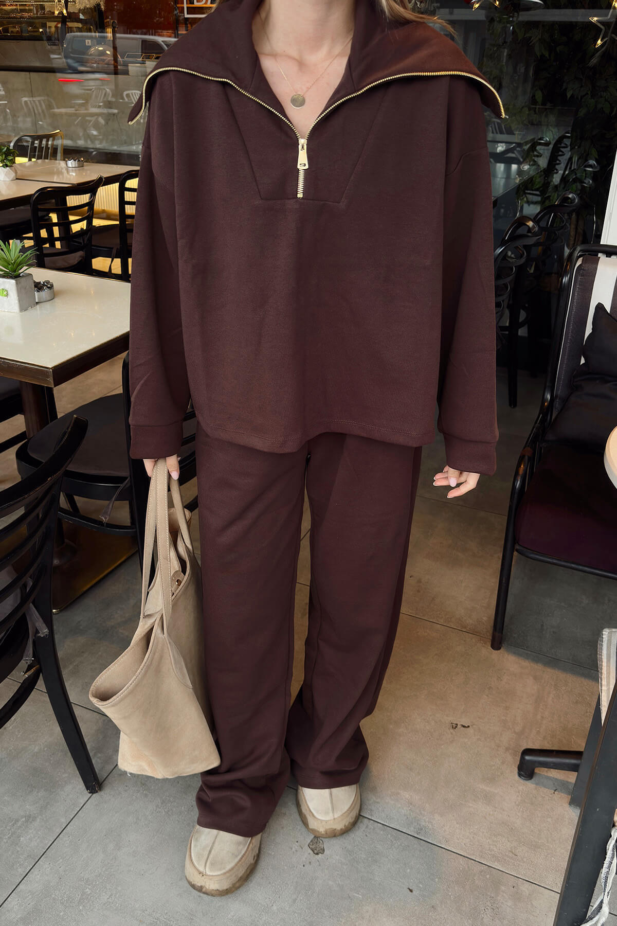 Yarım Fermuar Sweat Pantolon Kadın Alt Üst Takım, konfor odaklı tasarımı ve modern çizgileriyle günlük stilin vazgeçilmez parçaları arasında yer alır. Üst parçada yer alan yarım fermuar detayı, takıma sportif ve dinamik bir görünüm kazandırırken kullanım kolaylığı sağlar. Sweat üst ve pantolonun uyumlu formu, rahat kesimiyle gün boyu konfor sunar. Yumuşak dokulu kumaşı, vücuda nazikçe temas ederek hareket özgürlüğünü destekler. Pantolonun dengeli kesimi, sportif şıklığı korurken şehir stiline uyum sağlar. Günlük kombinlerden hafta sonu stiline, ev konforundan seyahat kombinlerine kadar geniş bir kullanım alanına sahip olan bu kadın alt üst takım, zahmetsiz ve stil sahibi bir görünüm sunar. Sneaker ve basic aksesuarlarla kolayca tamamlanabilen bu takım, sezon trendlerine uyum sağlayan sade ama etkili tasarımıyla modern kadın gardırobunun kurtarıcı parçalarından biri olur.