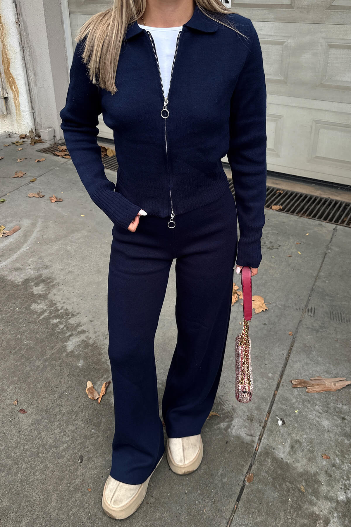 Lacivert Cara Polo Yaka Çift Yönlü Fermuarlı Crop-Pantolon Kadın Triko Alt Üst Takım