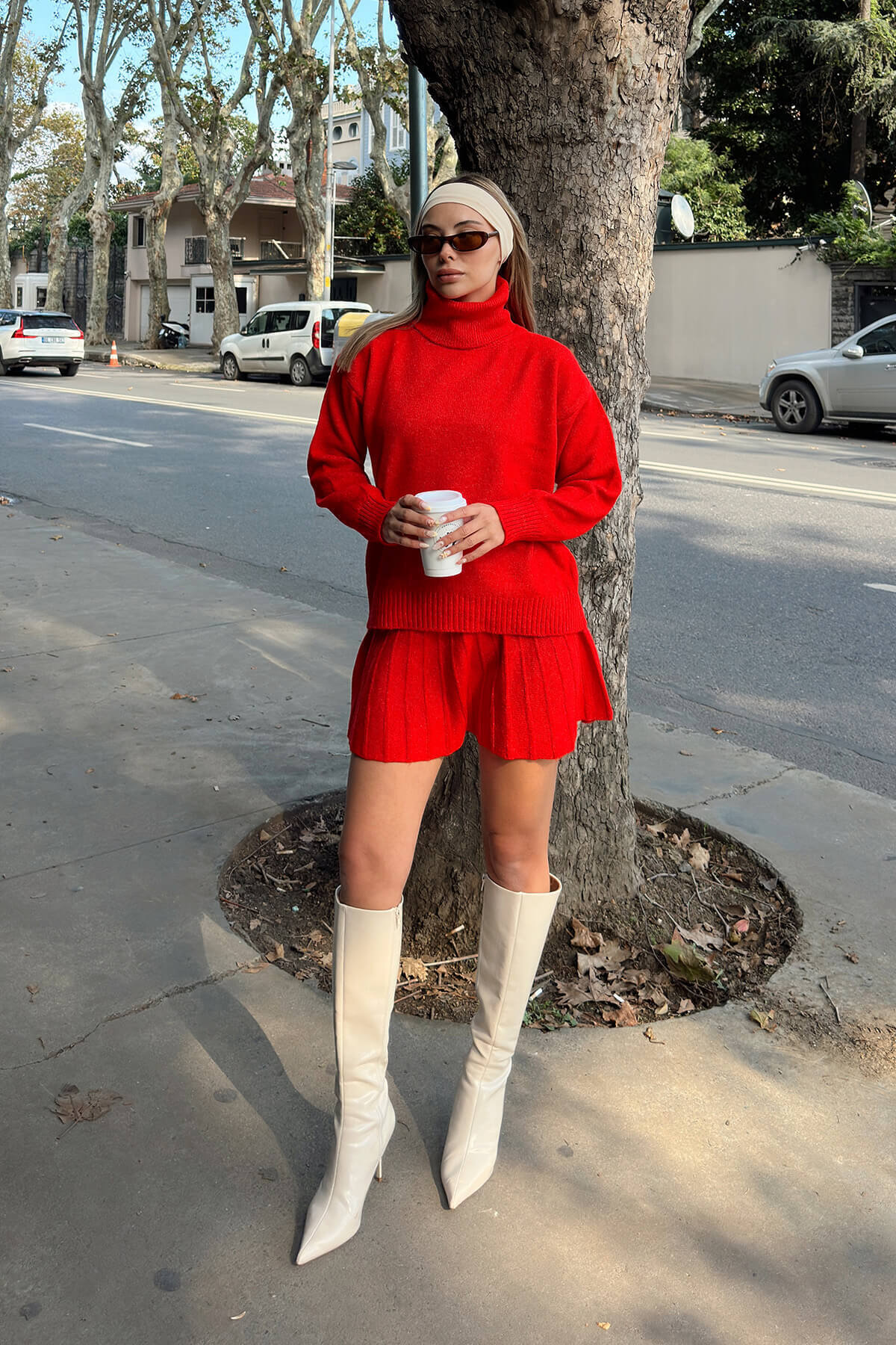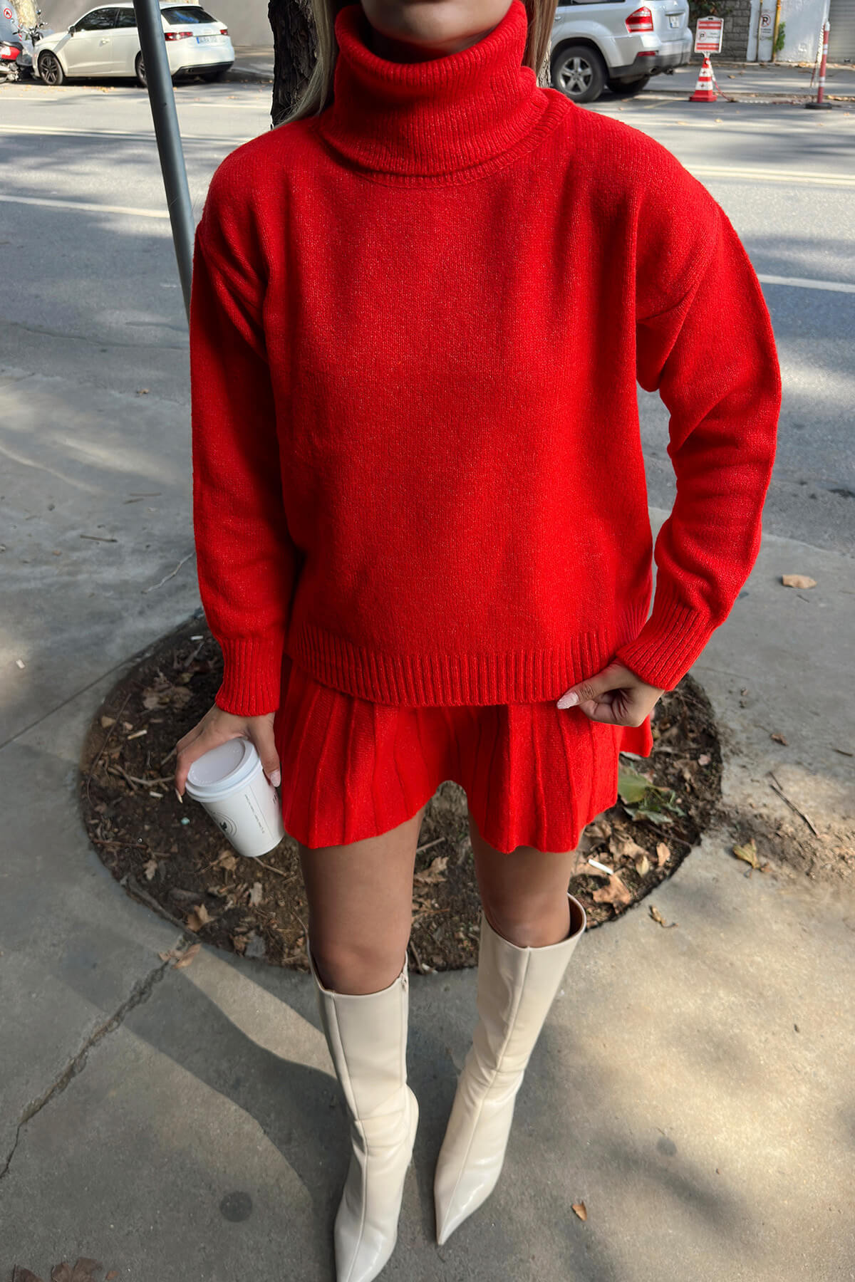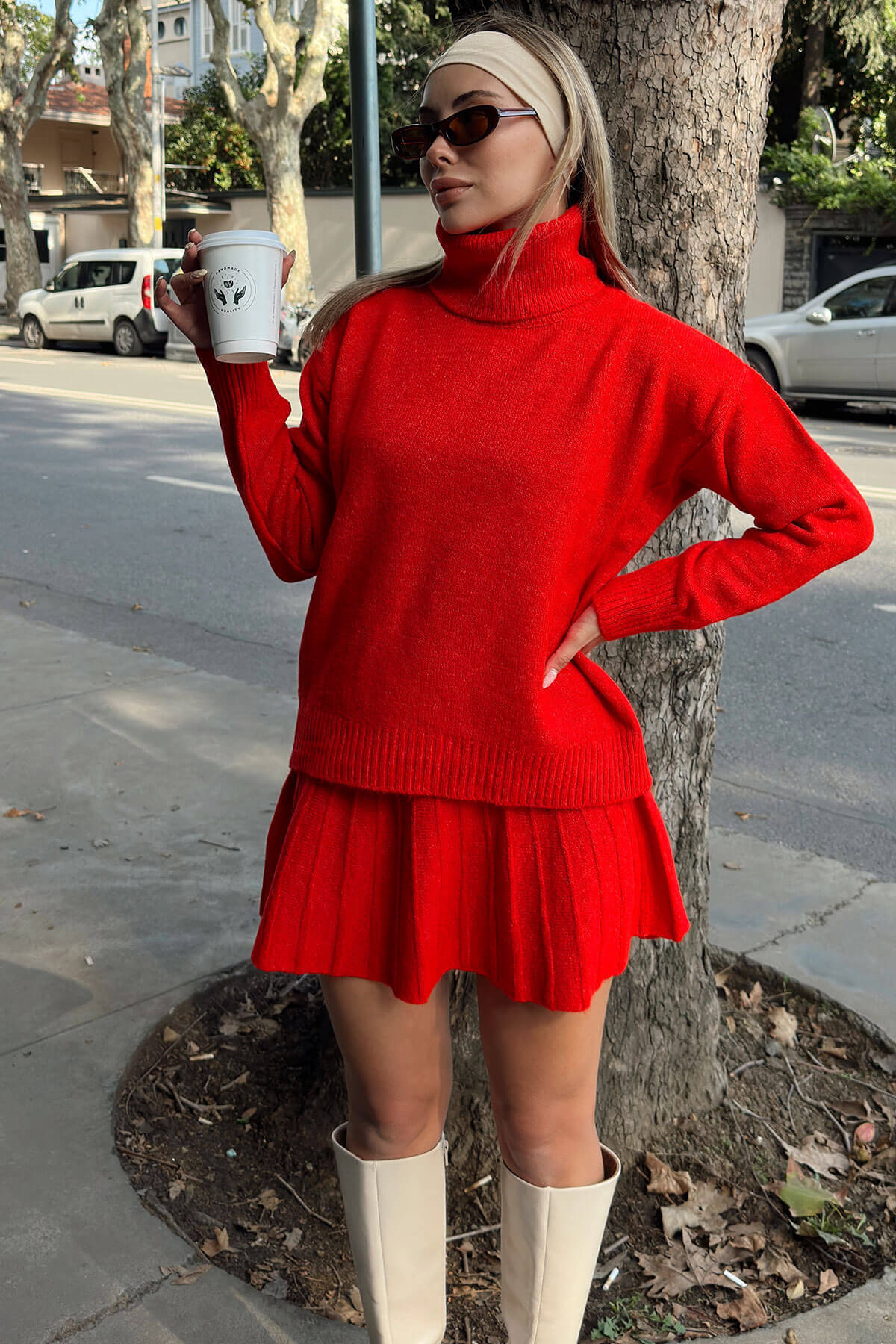 Nar Çiçeği Raina Balıkçı Yaka Kazak-Pilise Etekli Kadın Triko Alt Üst Takım