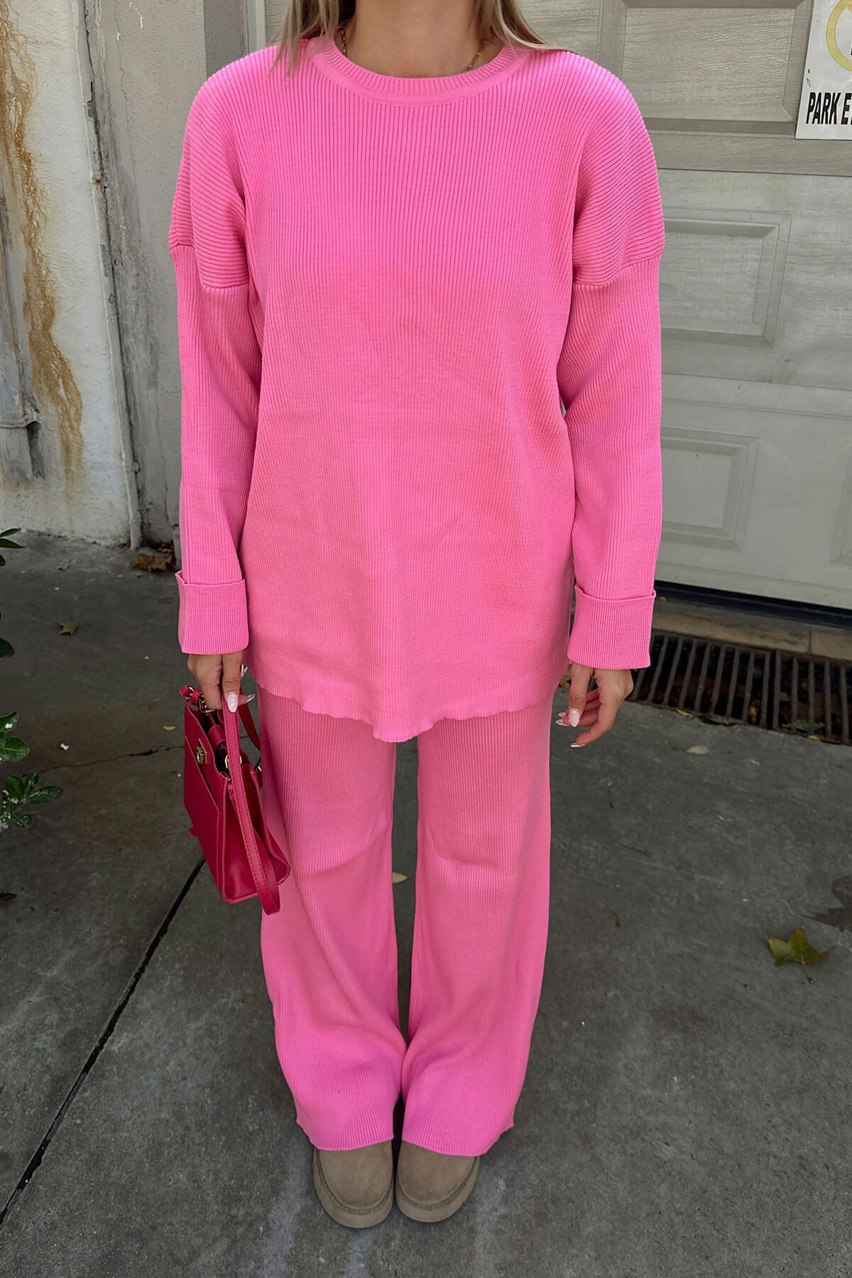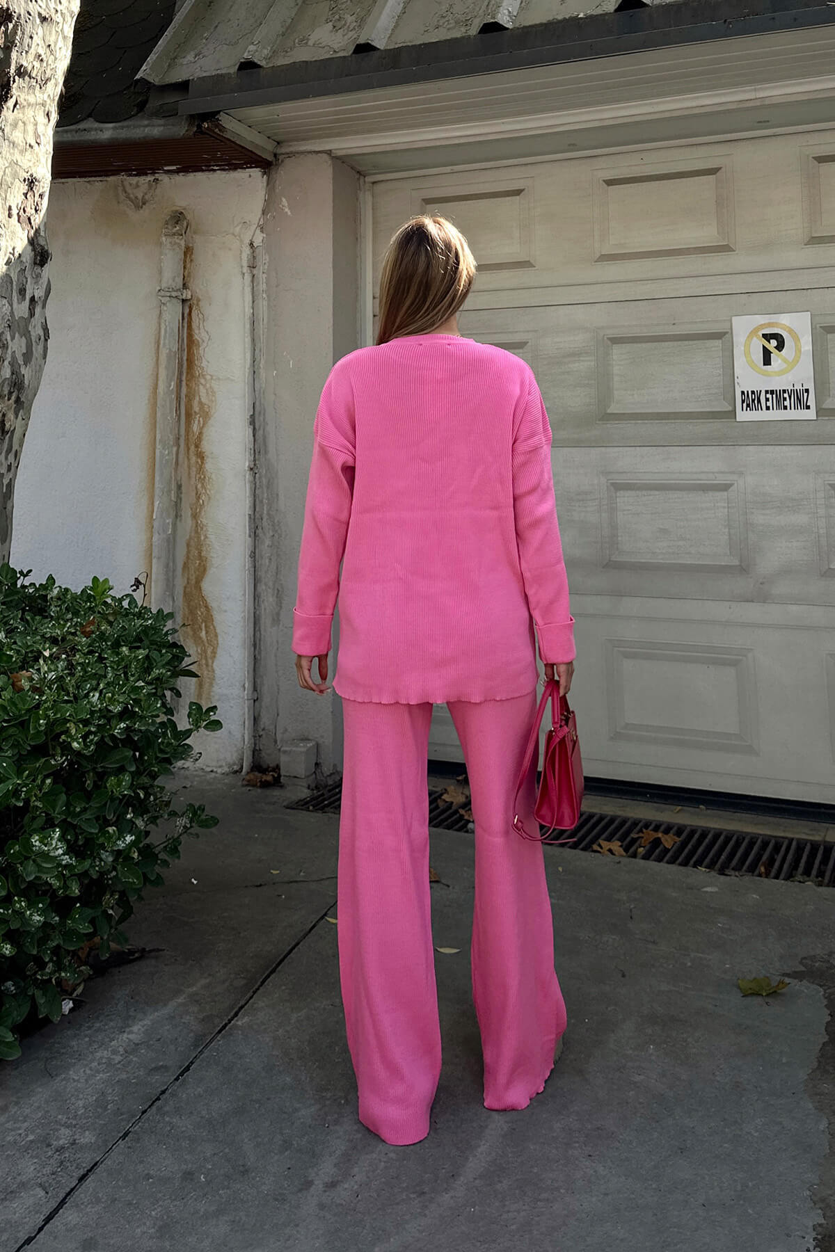 Pembe Deg Fitilli Kazak-Pantolon Kadın Triko Alt Üst Takım
