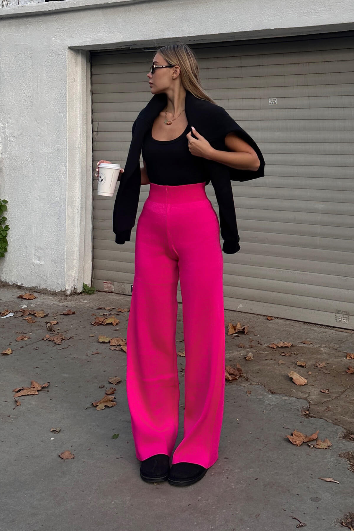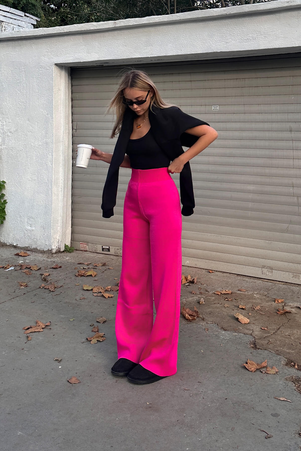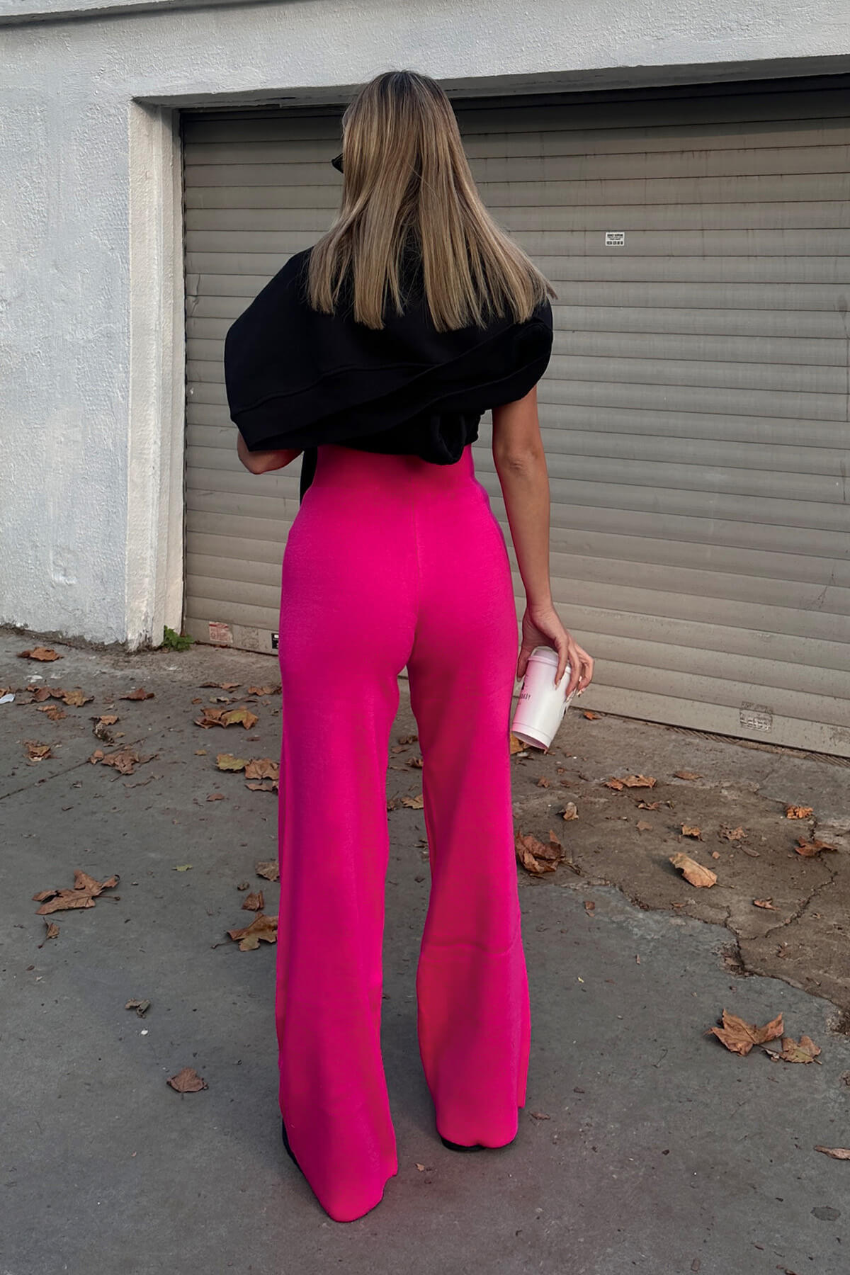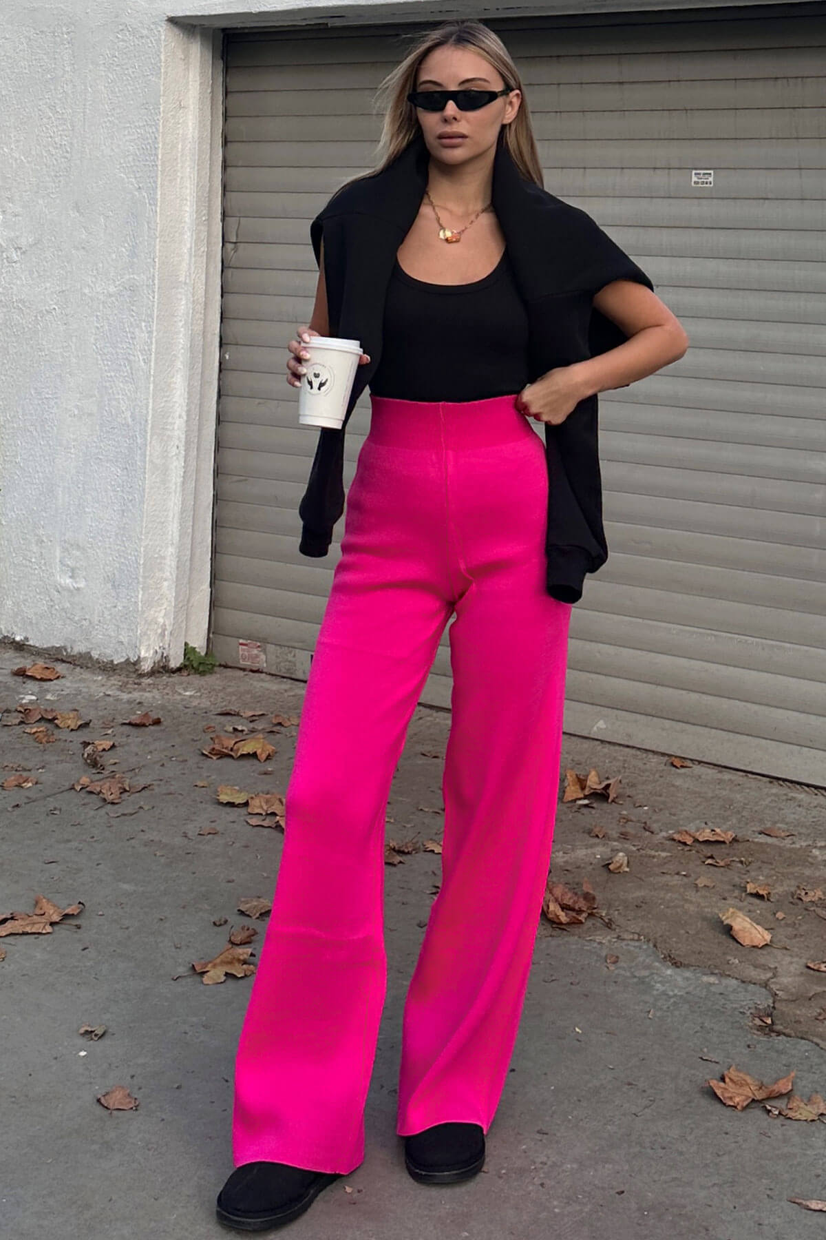 Pembe Yüksek Bel Beli Lastikli Kadın Triko Pantolon
