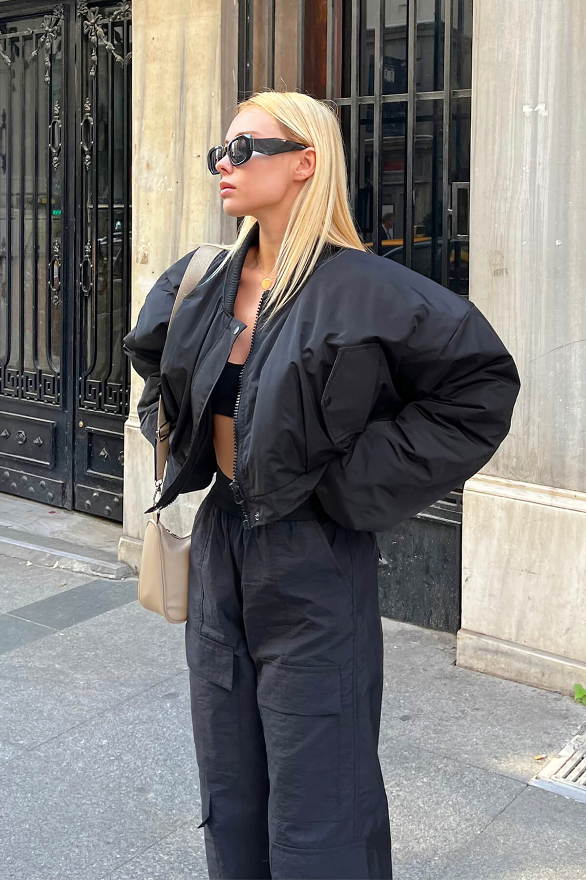 Bu modern ve şık kadın kalın şişme mont, soğuk kış günlerinde sıcaklık ve stilin mükemmel birleşimini sunuyor. Bomber tasarımı, klasik bir görünüme modern bir dokunuş katarken aynı zamanda hafif ve konforlu bir kullanım sağlıyor. Bu mont, hem şehirdeki günlük kullanım için hem de açık hava maceraları için idealdir. Hem şık hem de işlevsel olan bu mont, modern kadının gardırobunda olmazsa olmaz bir parça. Bomber yaka ve crop kesim kombinasyonu, trend ve şık bir görünüm yaratırken, kalın şişme yapısı her kombininize sofistike bir dokunuş katacak. Bu şişme mont, ister spor ayakkabılarla ister botlarla kombinlendiğinde, her ortamda dikkat çekici ve unutulmaz bir stil oluşturuyor.