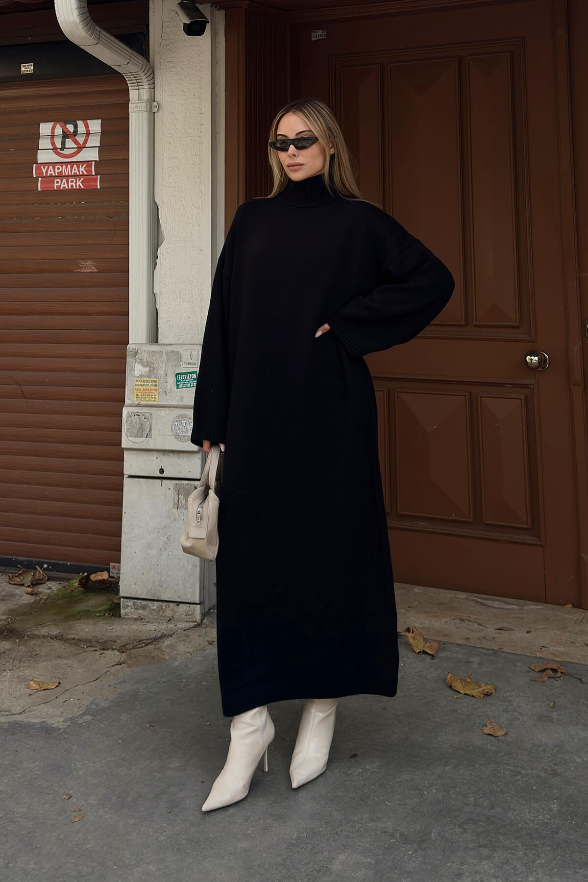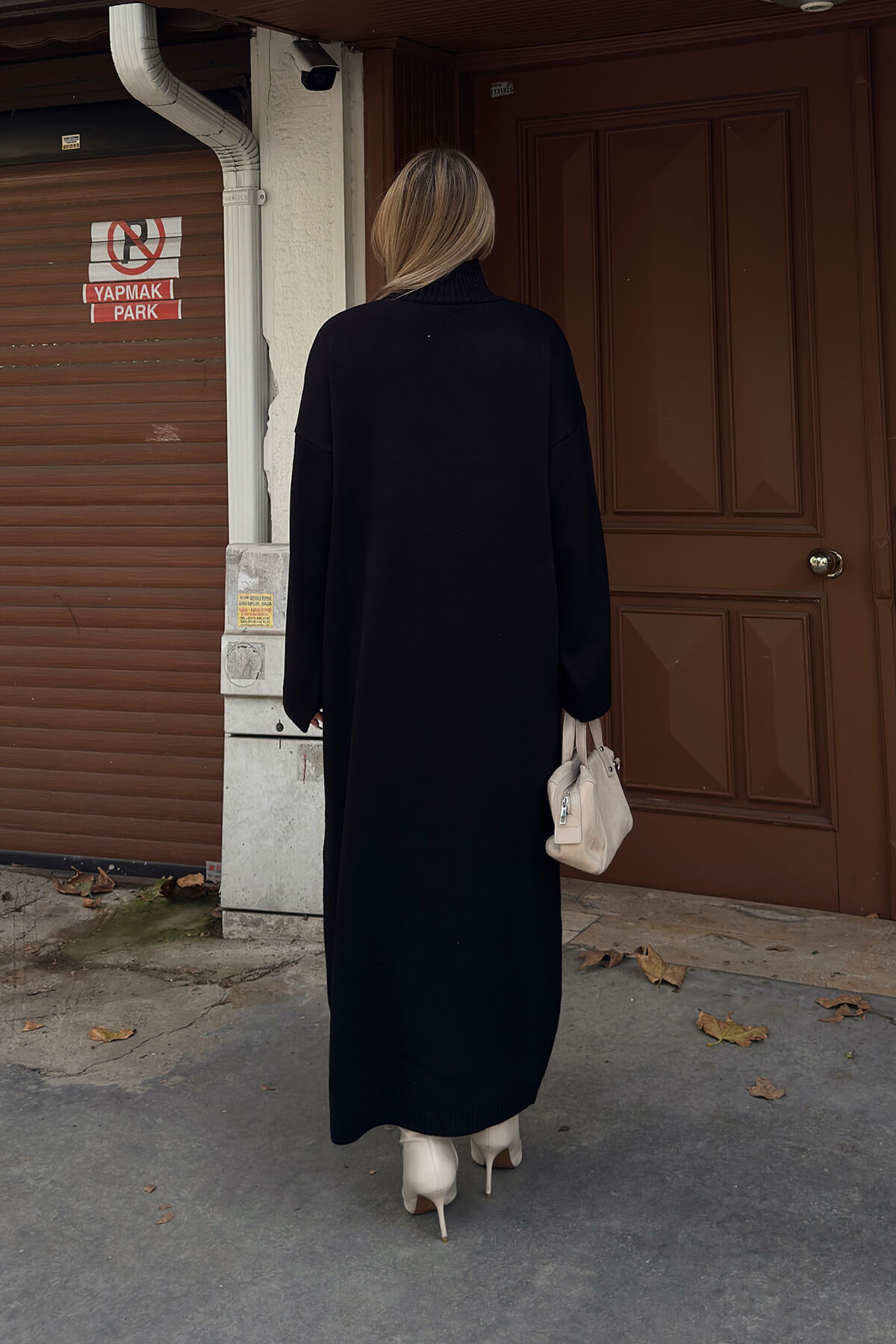 Siyah Daly Yarım Balıkçı Oversize Kadın Triko Midi Elbise