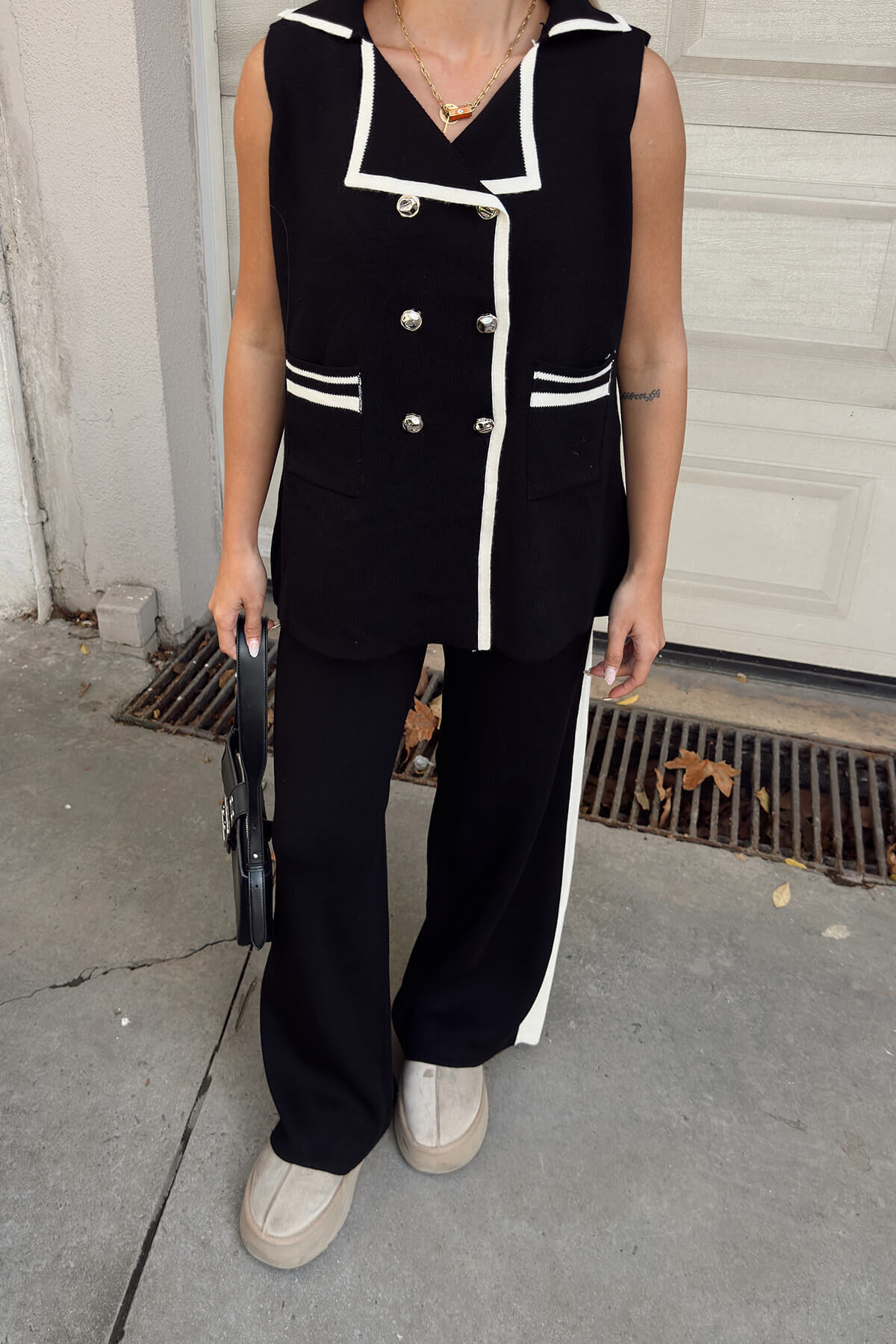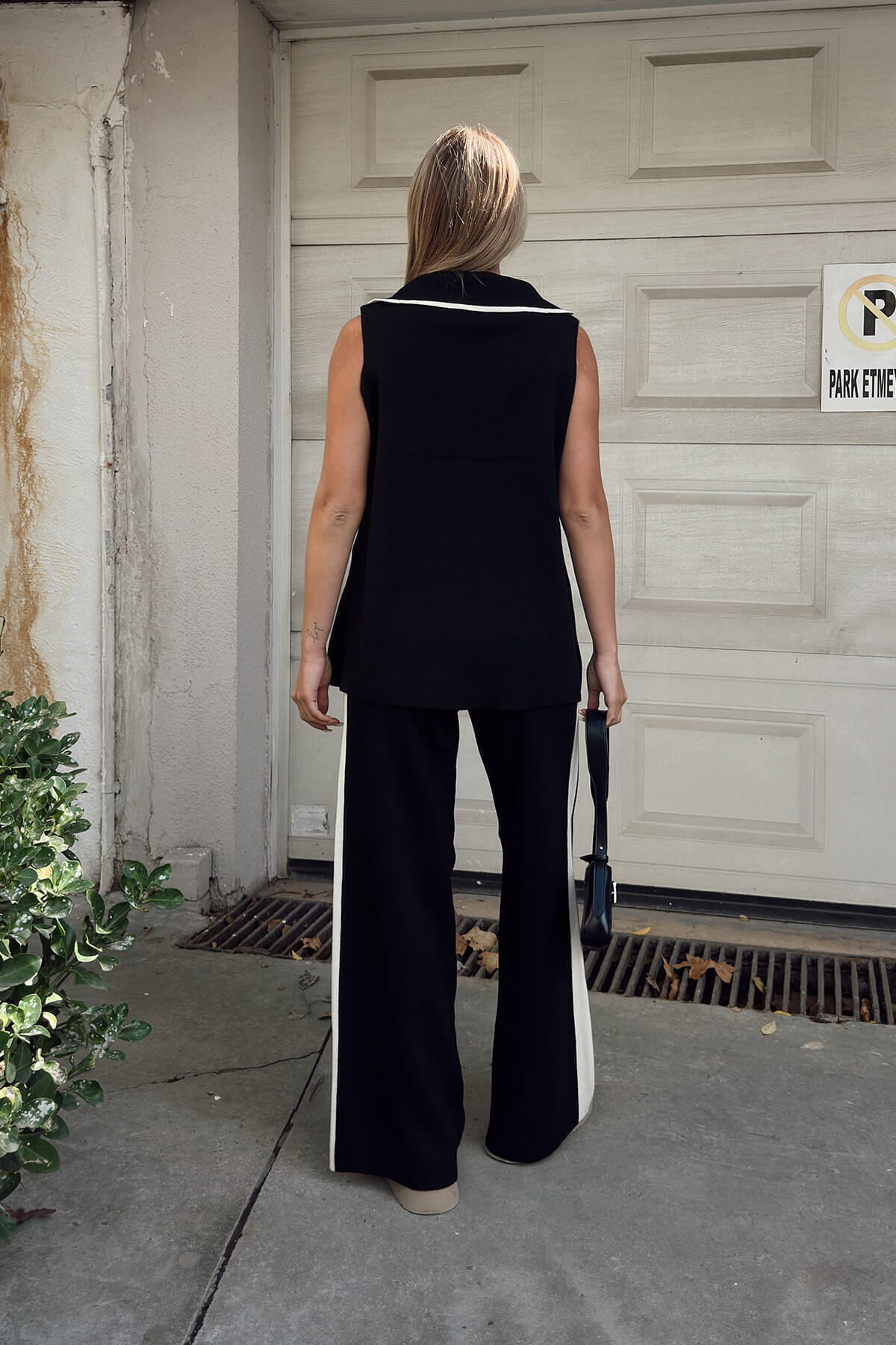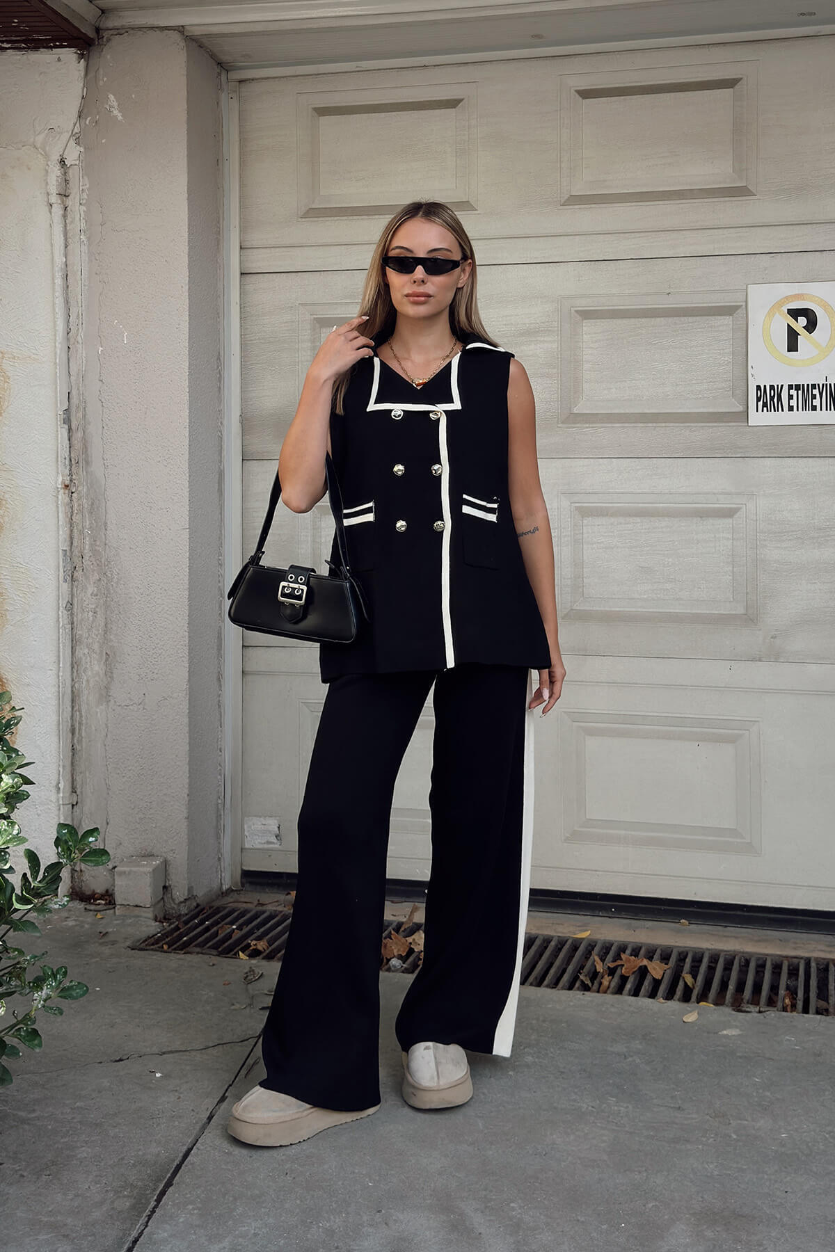 Siyah Kruvaze Şerit Detaylı Yelek-Pantolon Kadın Triko Alt Üst Takım - 1