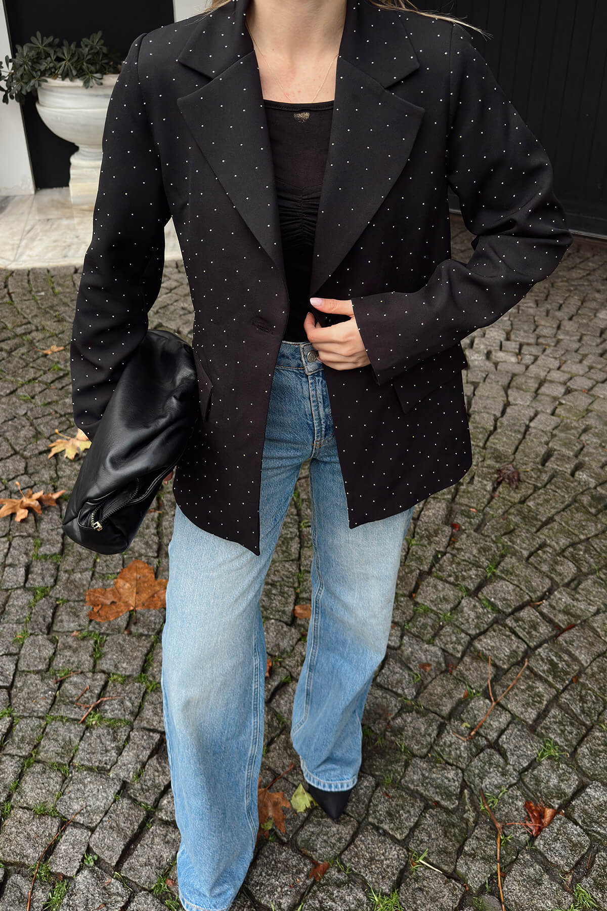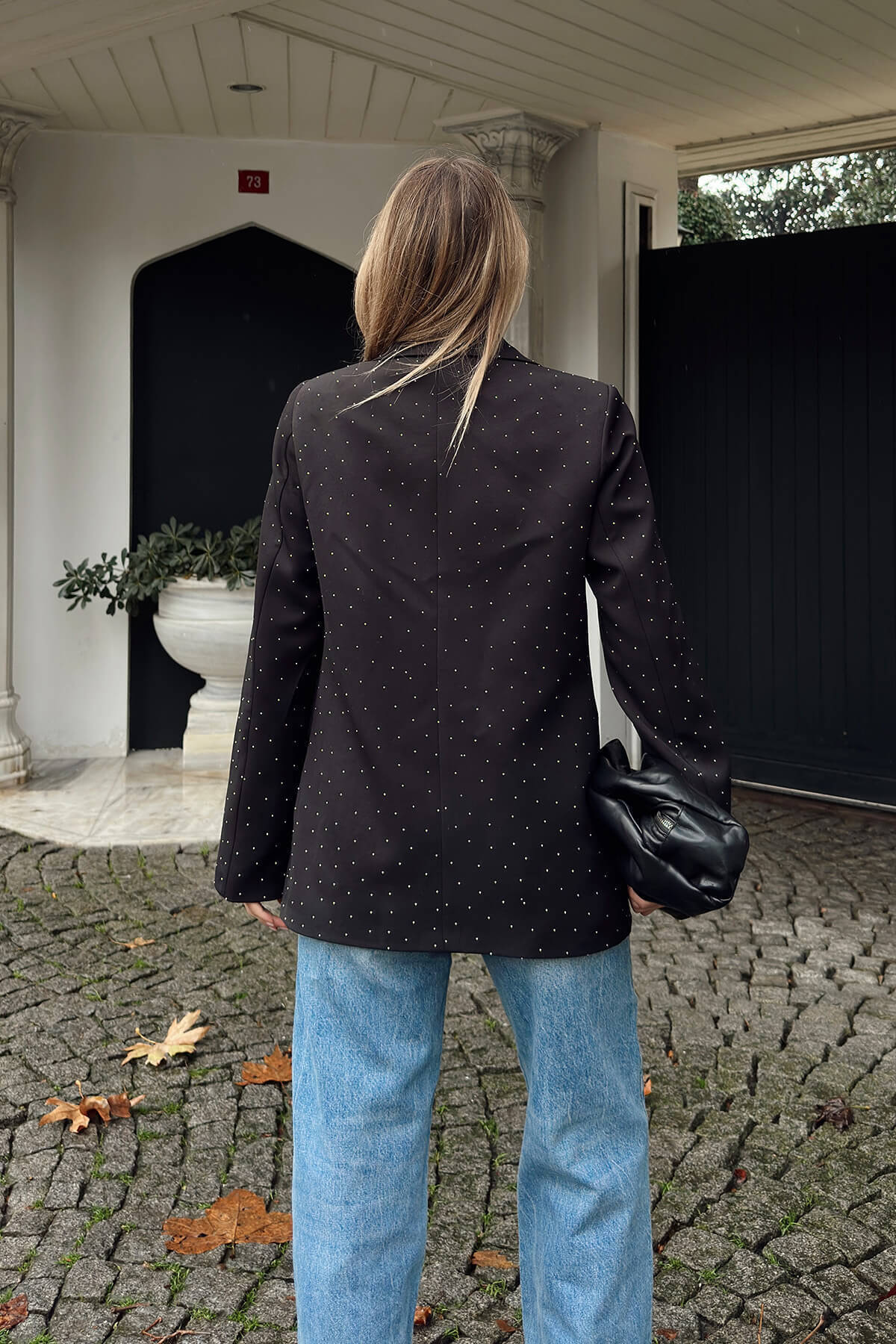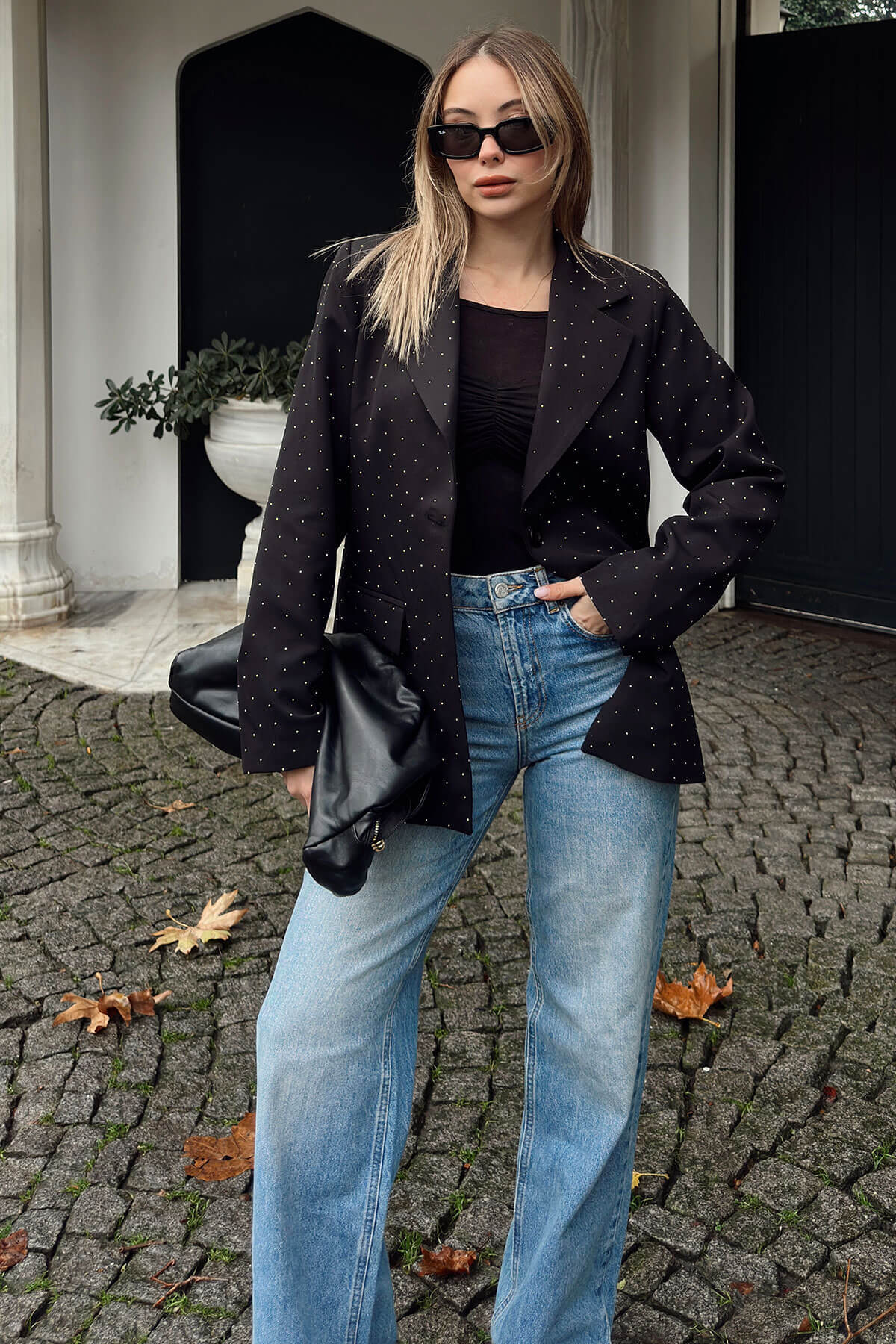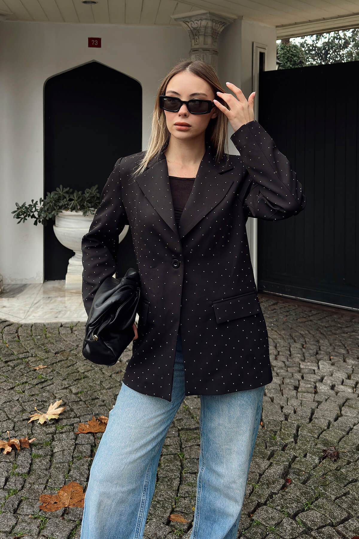 Taş Detaylı Kruvaze Yaka Tek Düğmeli Kadın Blazer Ceket, güçlü ve sofistike duruşuyla kadın giyiminde şıklığı yeniden tanımlar. Kruvaze yaka kesimi, klasik blazer formuna modern bir hava kazandırırken vücut proporsiyonunu dengeli şekilde öne çıkarır. Tek düğmeli tasarımı sayesinde sade ama iddialı bir görünüm sunan bu blazer ceket, taş detaylarıyla stiline zarif bir ışıltı ekler. İnce işçilikle yerleştirilen taşlar, ceketin feminen ve dikkat çekici bir karakter kazanmasını sağlar. Yapılandırılmış formu, omuz ve bel hattını toparlayarak daha fit bir siluet oluşturur. Ofis kombinlerinden özel davet stillerine kadar geniş bir kullanım alanına sahip olan bu kadın blazer ceket; kumaş pantolonlar, etekler ve elbiselerle rahatlıkla kombinlenebilir. Zamansız tasarımı ve şık detaylarıyla sezon trendlerine uyum sağlayan bu parça, modern ve güçlü bir stil arayan kadınlar için ideal bir tamamlayıcıdır.