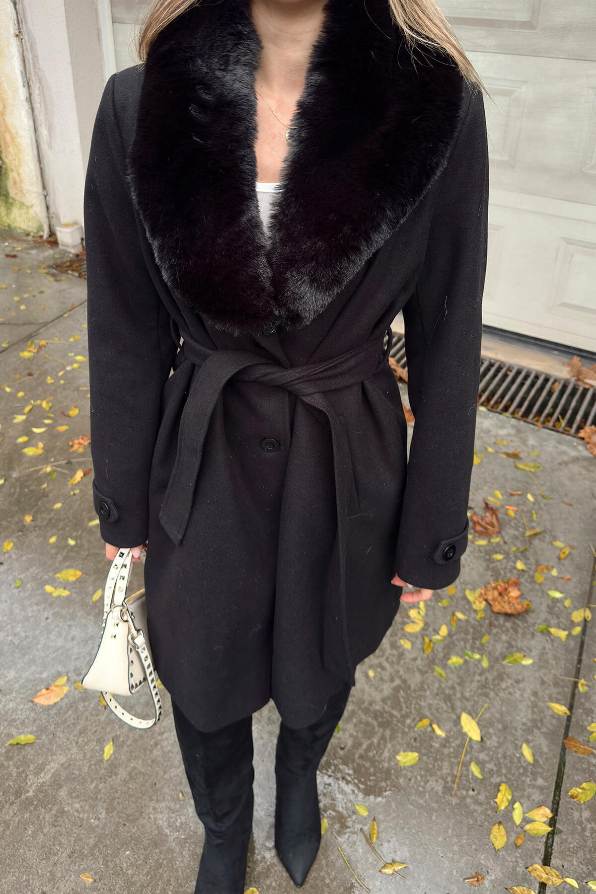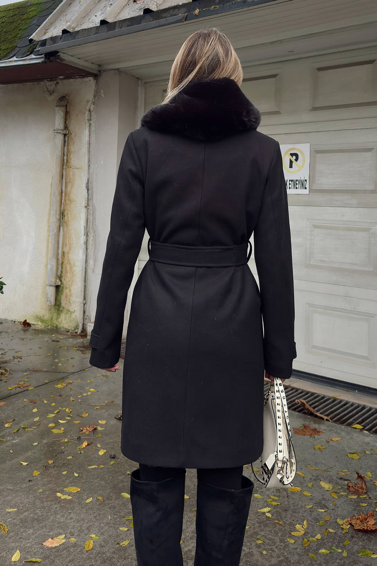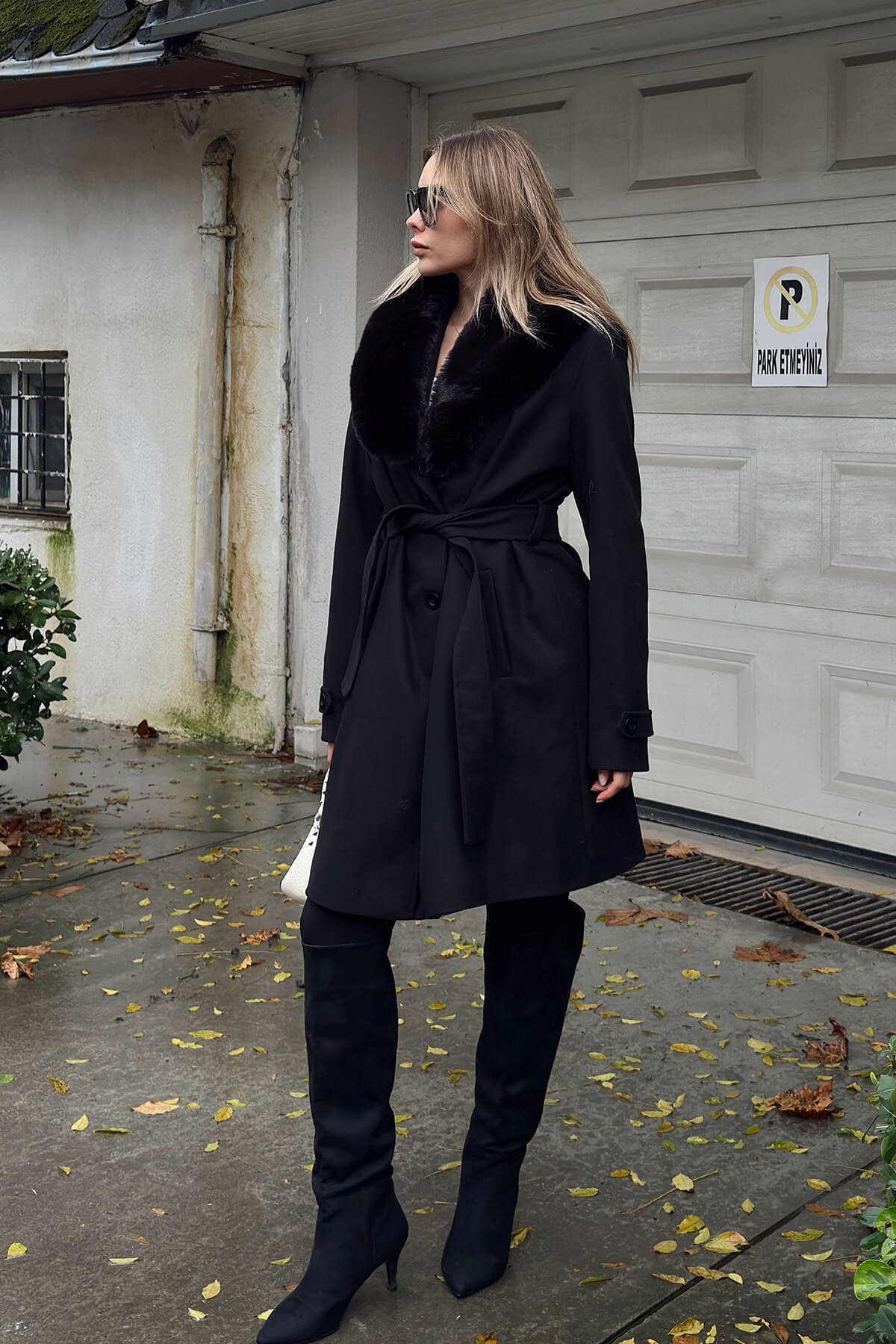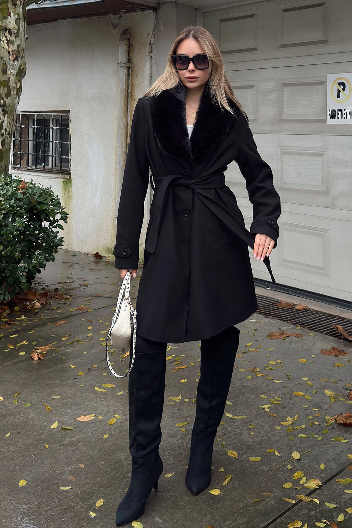 Siyah Yaka Kürklü Kol Manşet Detay Kuşaklı Kadın Kaşe Kaban