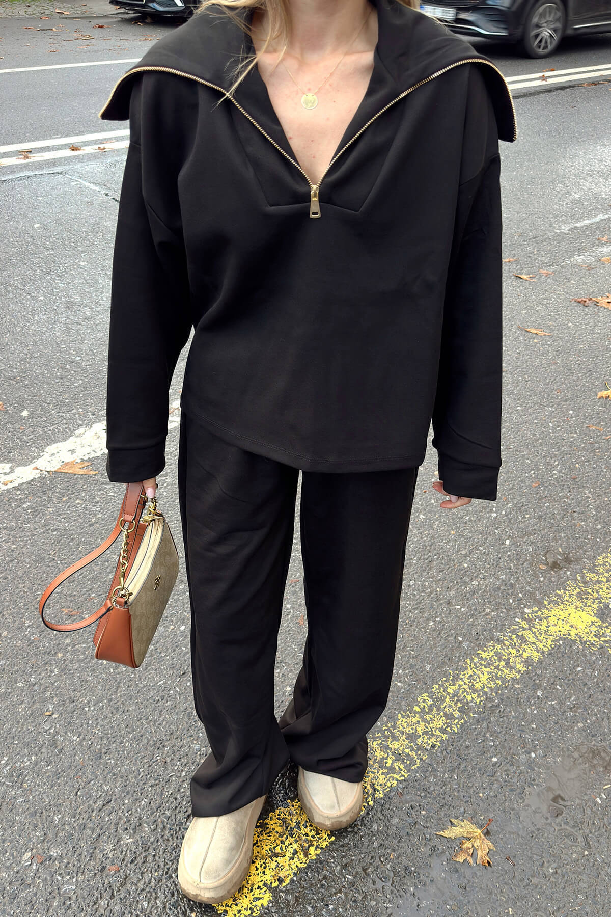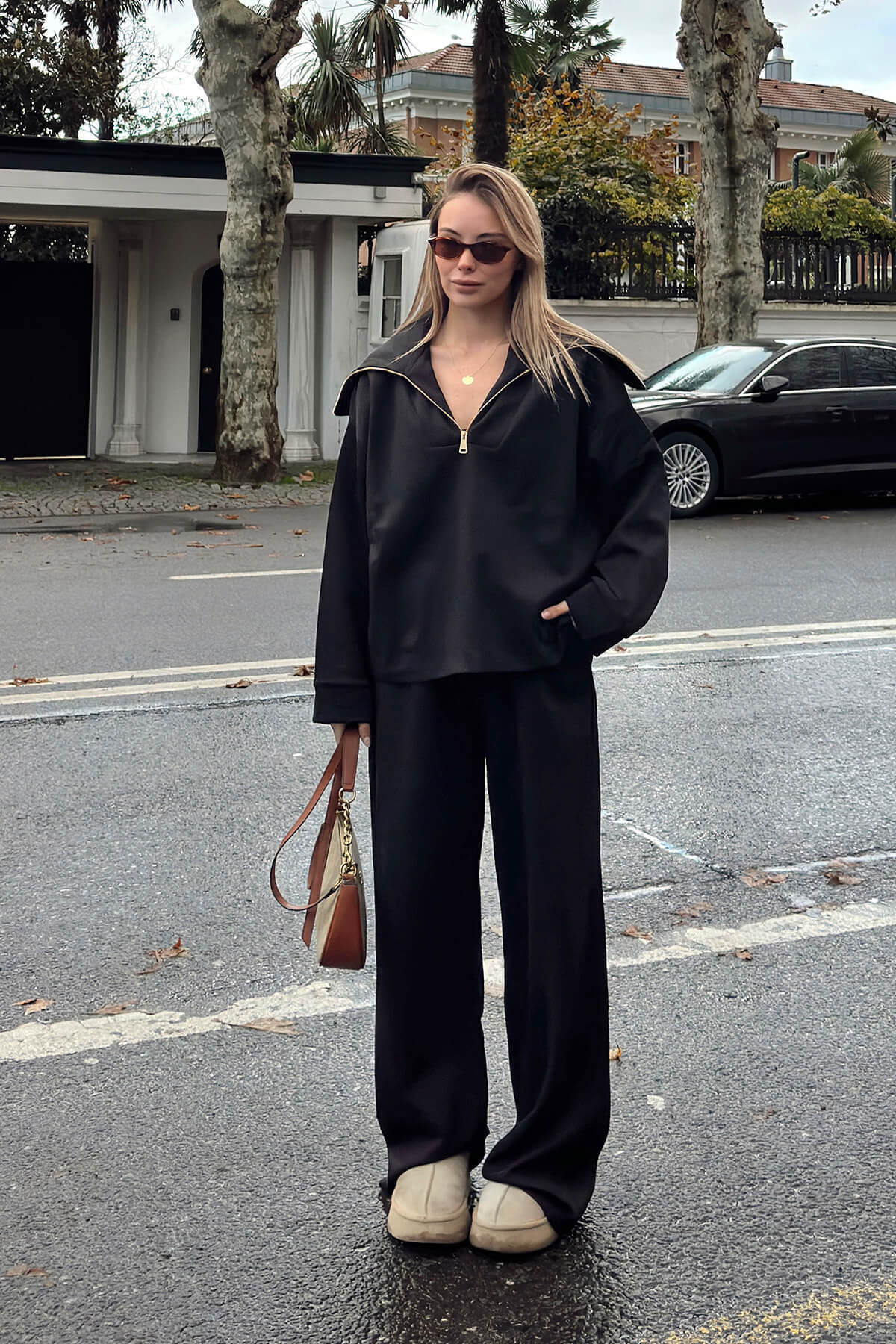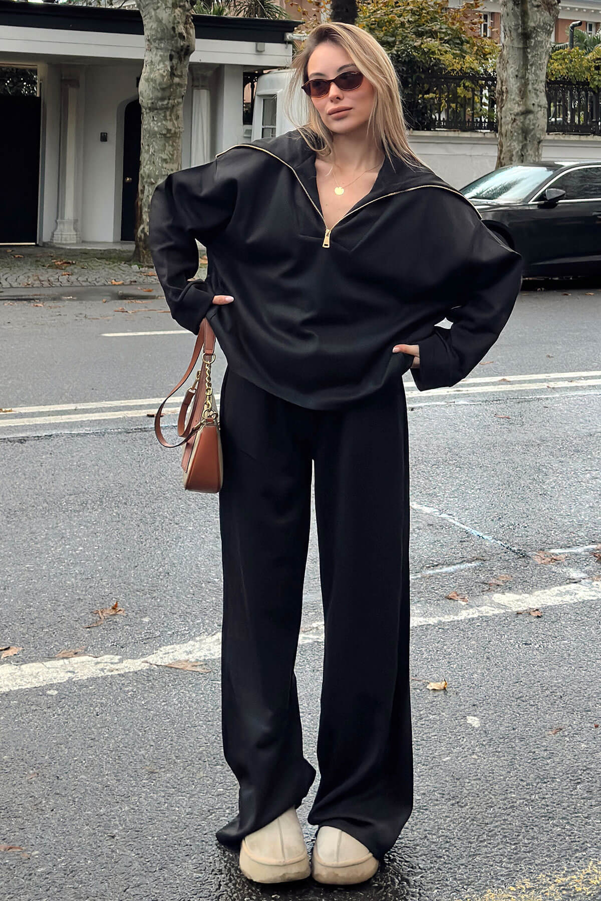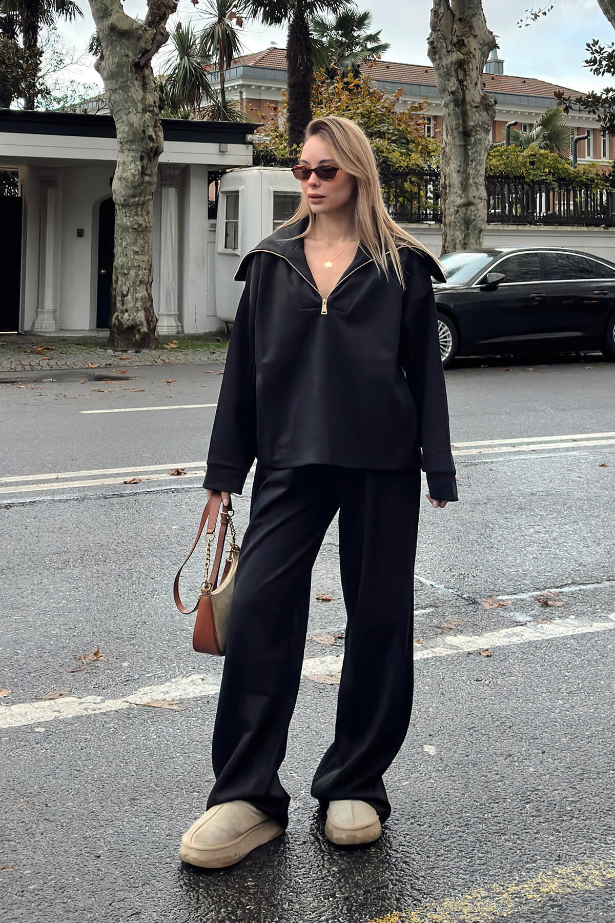 Siyah Yarım Fermuar Sweat Pantolon Kadın Alt Üst Takım